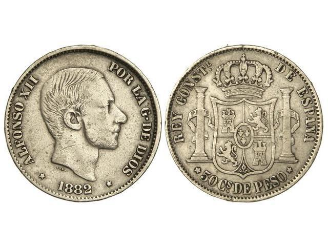 50 Centavos de Peso. 1882. MANILA. (Golpecitos). MBC-.