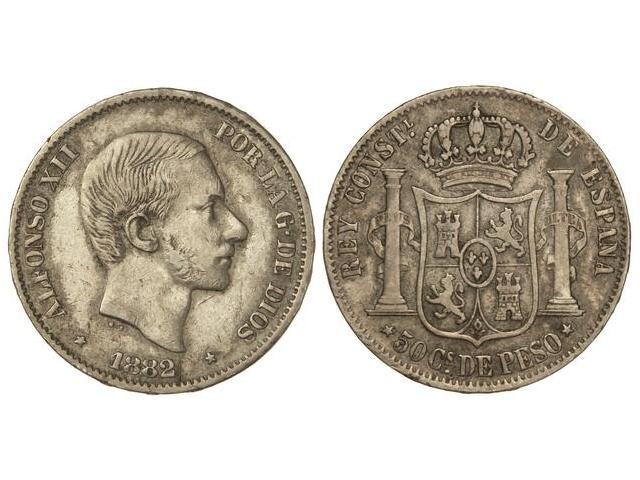 50 Centavos de Peso. 1882. MANILA. (Pequeños golpecitos). MBC-/MBC.