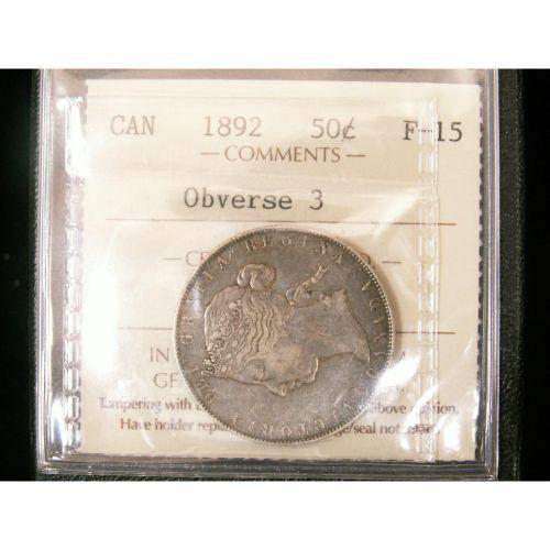 50 Cents 1892, graded ICCS F-15; Obverse # 3. So close to a VF, Nice original grey toning.