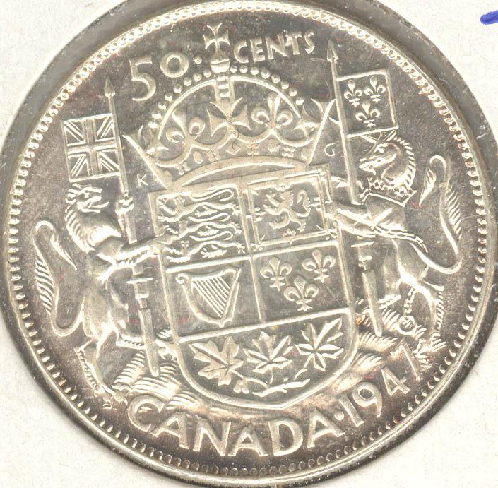 50 Cents 1947, grade MS-62; Maple Leaf, Straight 7/7.