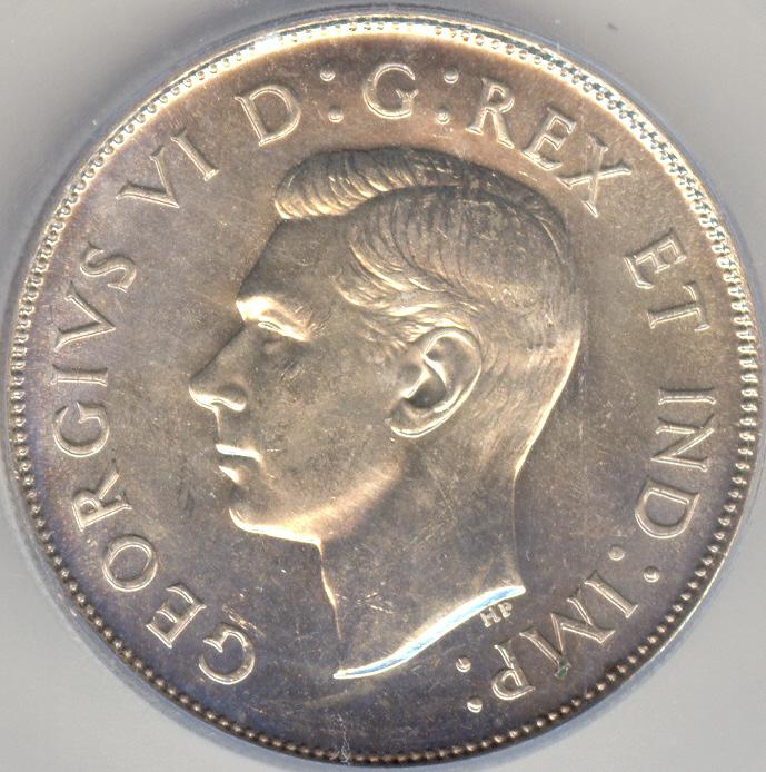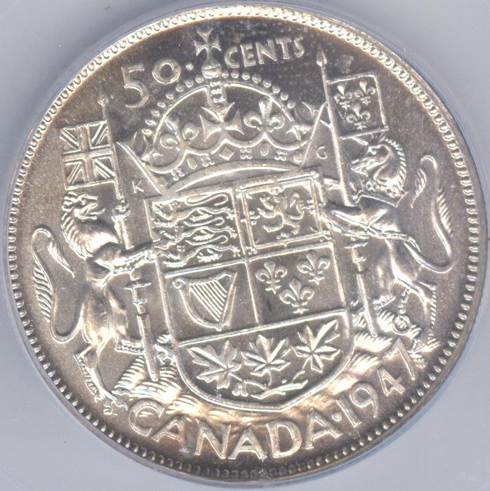 50 Cents 1947, graded ICG MS-66; Maple Leaf, Curved Left 7.