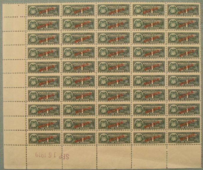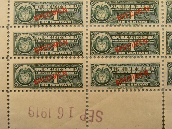 Here is a plate block of (50) small size 1 Centavo Revenue Stamps from Republic De Colombia, marked "IMPUESTO DE CONSUMO." Each has a red "SPECIMEN" overprint and security punch. They are marked "American Bank Note Co." The lower margin has a stamped date of SEP 16 1919. They are gummed and unused, in very good condition. There is some some slight separation at one of the perforated edges.