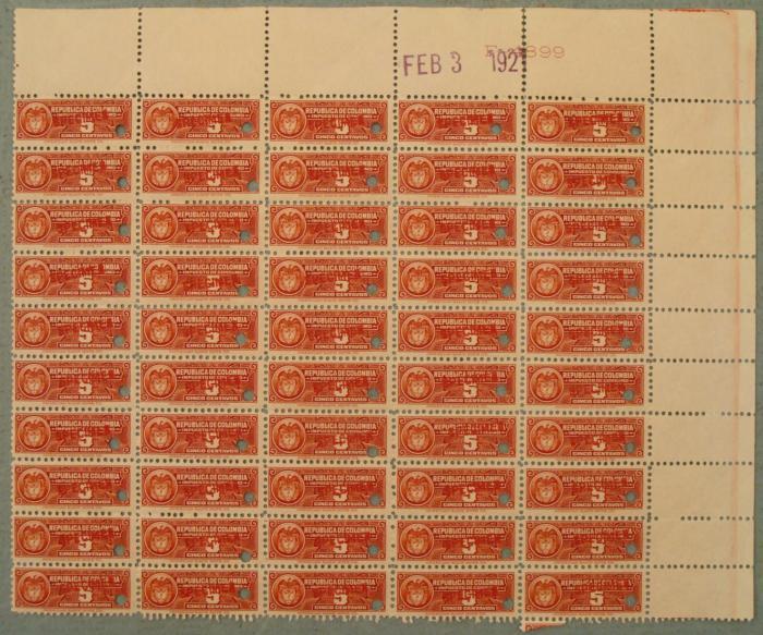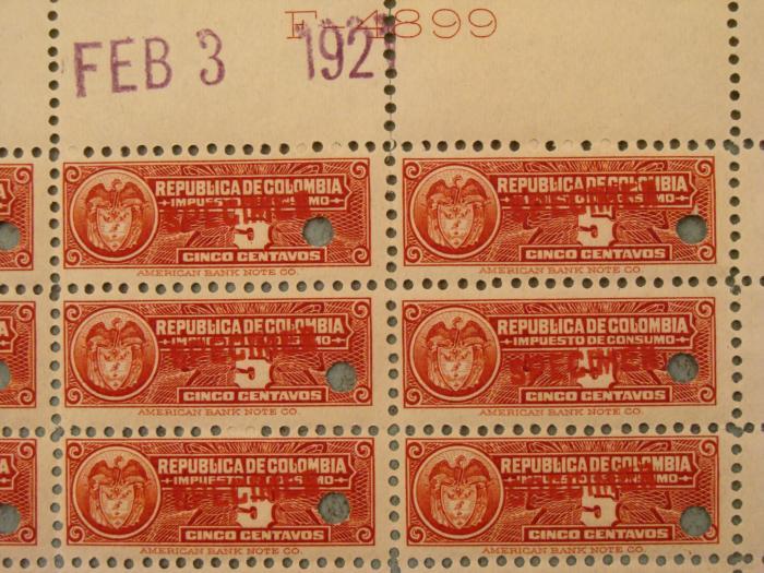 Here is a plate block of (50) small size 5 Centavos Revenue Stamps from Republic De Colombia, marked "IMPUESTO DE CONSUMO." Each has a red "SPECIMEN" overprint and security punch. They are marked "American Bank Note Co." The upper margin has a printed series number, and stamped date of FEB 3 1921. They are gummed and unused, in very good condition. There is some some slight separation at one of the perforated edges.