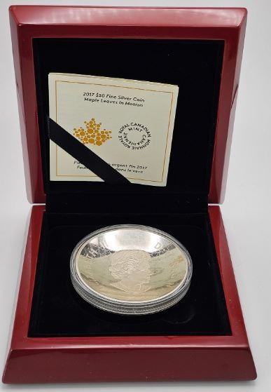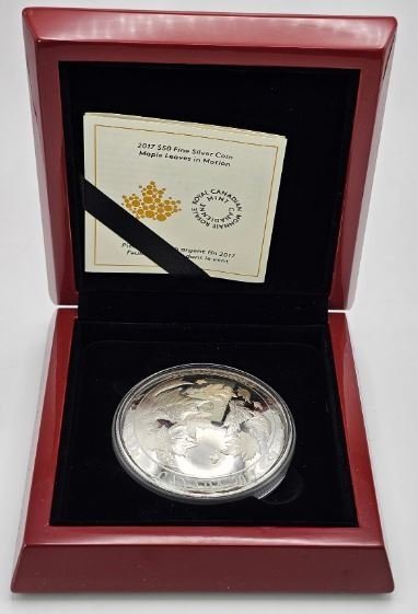 50 DOLLARS 2017 FEUILLES D'ÉRABLE DANS LE VENT 5 OZ FINE SILVER .999