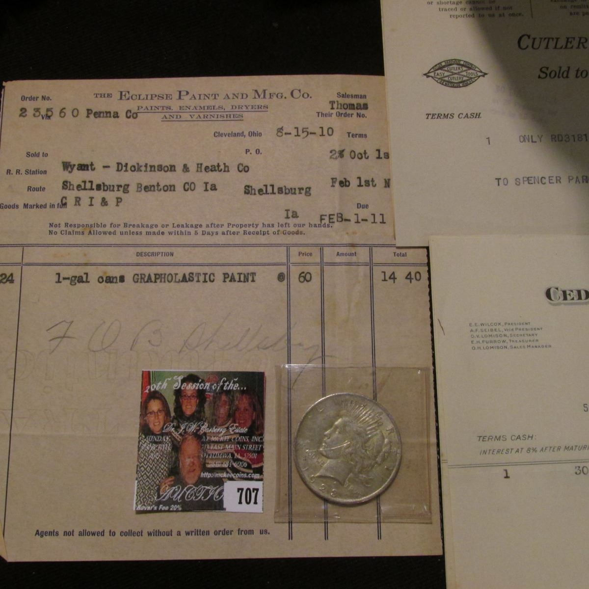(50) Old Invoices dating back to 1916 from "Cutler Hardware Company Waterloo, Iowa"; (6) 1923 era invoices "Cedar Rapids Commission Co. Fruits and Produce Cedar Rapids, Iowa"; 1911 Invoice "Wyant-Dickinson & Heath Co."; & 1923 P U.S. Peace Silver Dollar, VF.