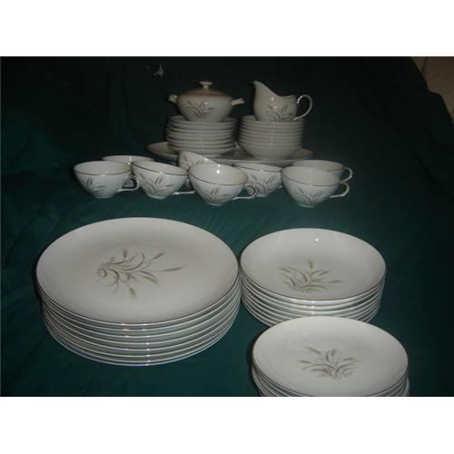 THIS SET HAS 8 DINNER PLATES - 8LARGE BOWLS - 8 SMALL BOWLS - 8 SAUCERS - 8 CUPS - 7 DESSERT PLATES 1 CREAM 1 SUGAR BOWL WITH LID 1 LARGE SERVING PLATTER THEY HAVE THE number 1965 ON THE BOTTOM ALL ARE IN GREAT SHAPE NO CRACKS OR CHIPS ANY QUESTIONS PLEASE E MAIL ME THANK YOU