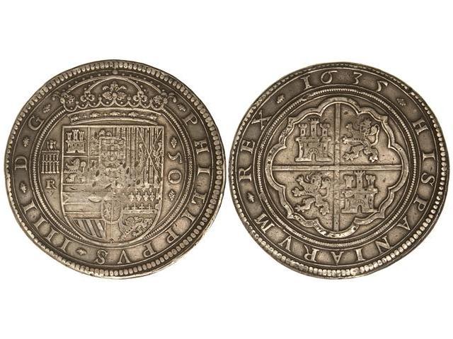 50 Reales. 1635. SEGOVIA. R. Anv.: PHILIPPVS.IIII.D.G. Rev.: HISPANIARVM.REX.1635. 168,71 grs. Sólo el Real Ingenio de Segovia bajo la licencia del Rey tenía el privilegio de acuñar este tipo de monedas. De tirada limitadísima,
