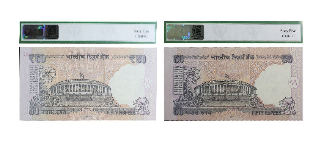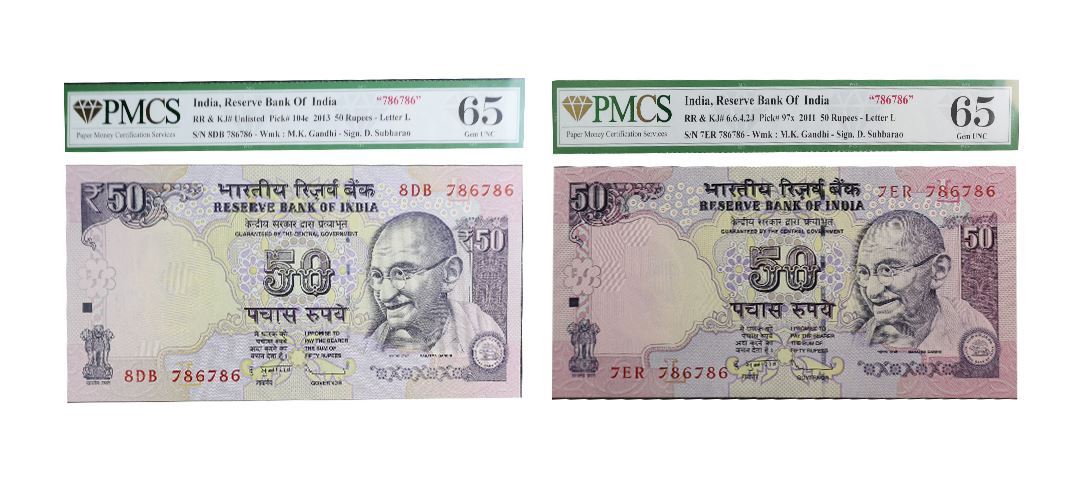 50 Rupees, 2011 & 2013, Set of 2 Notes, Old Gandhi Series, Fancy Number, Signed by D. Subbarao, Double 786, Inset I & L, Serial No: 8DB 786786 & 7ER 786786, PMCS graded 65 Gem Uncirculated.