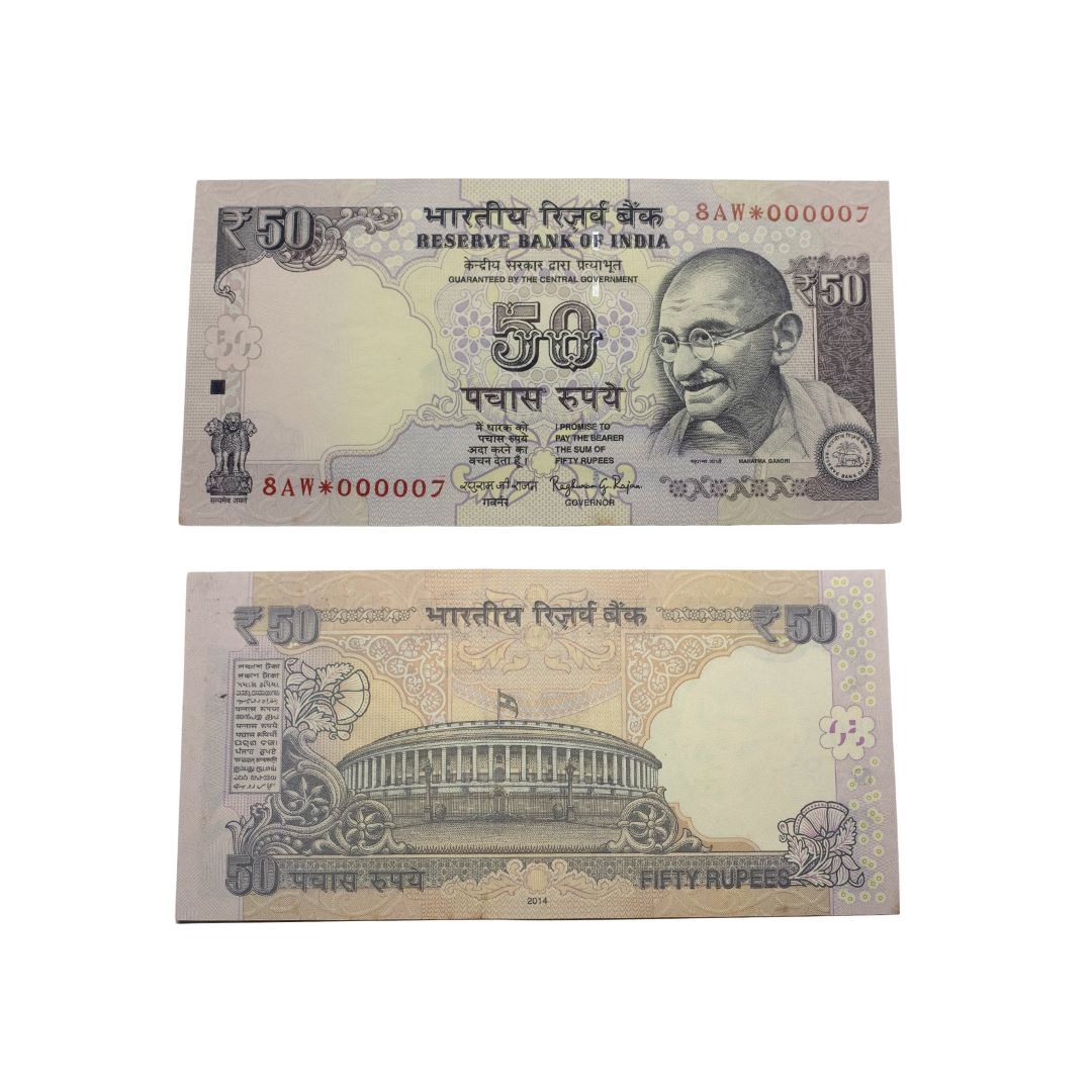 50 Rupees, 2014, Fancy Serial No. 8AW 000007(Lower Serial No.), signed by Raghuram Rajan.