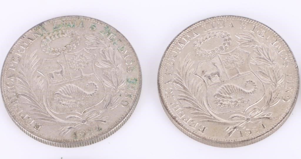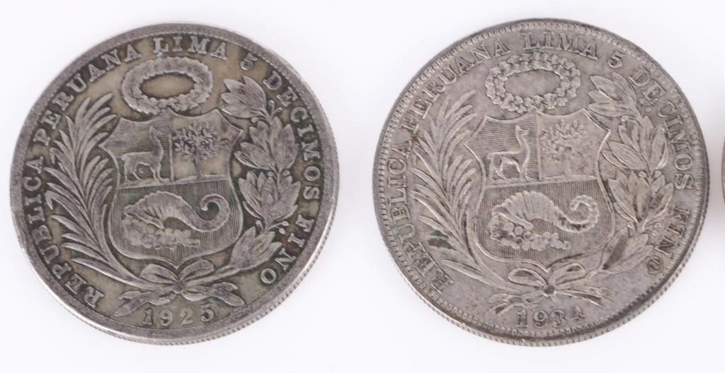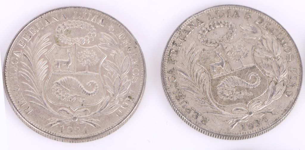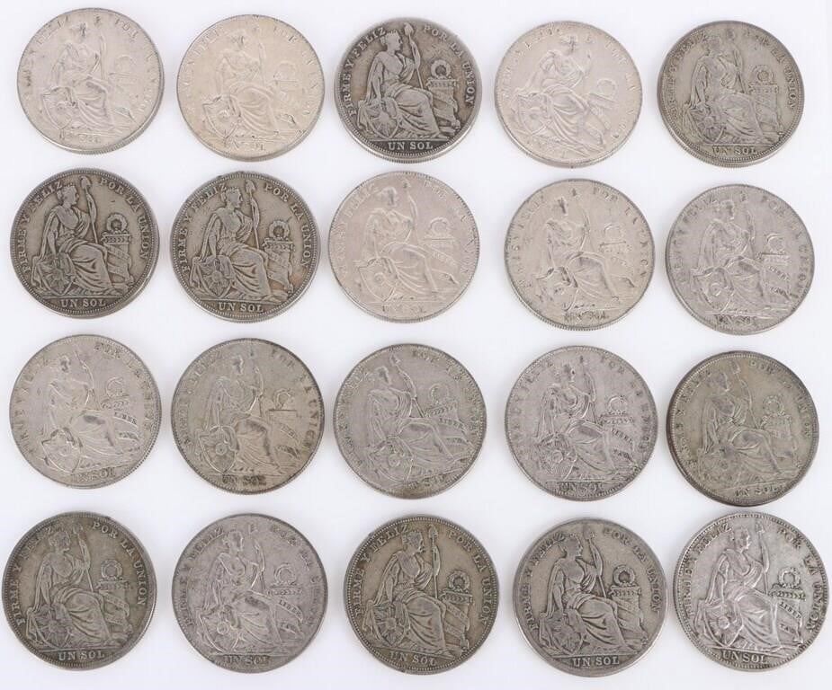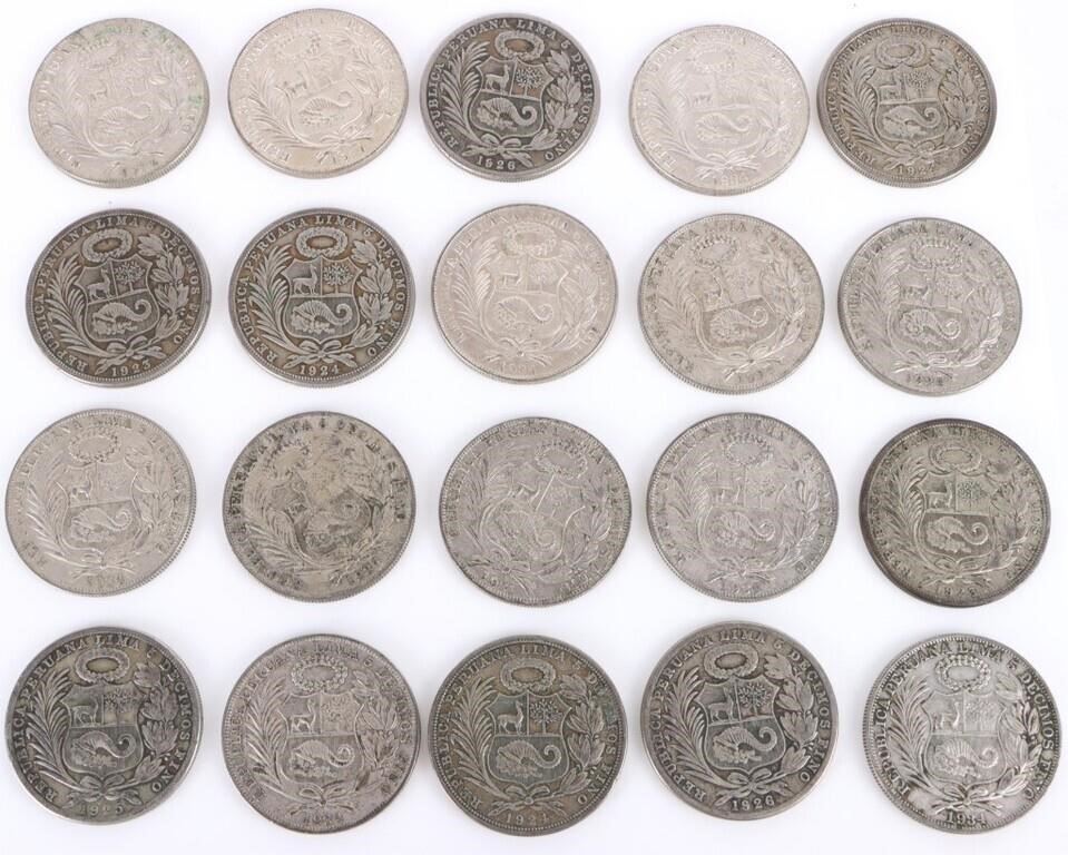 50% silver world silver coins: Peru Un Sol - lot of 20. Peruvian years include coins in between 1923-1934.