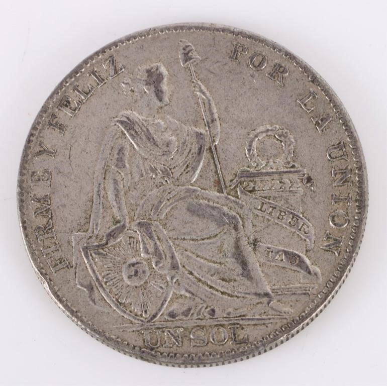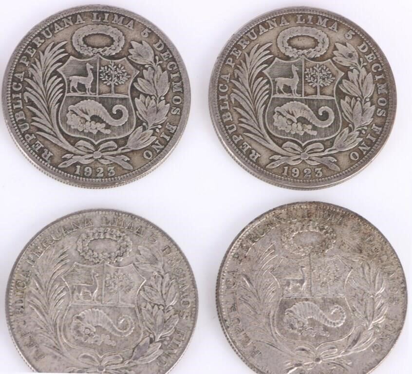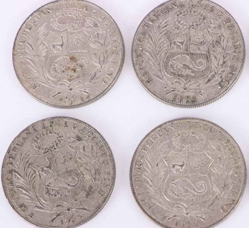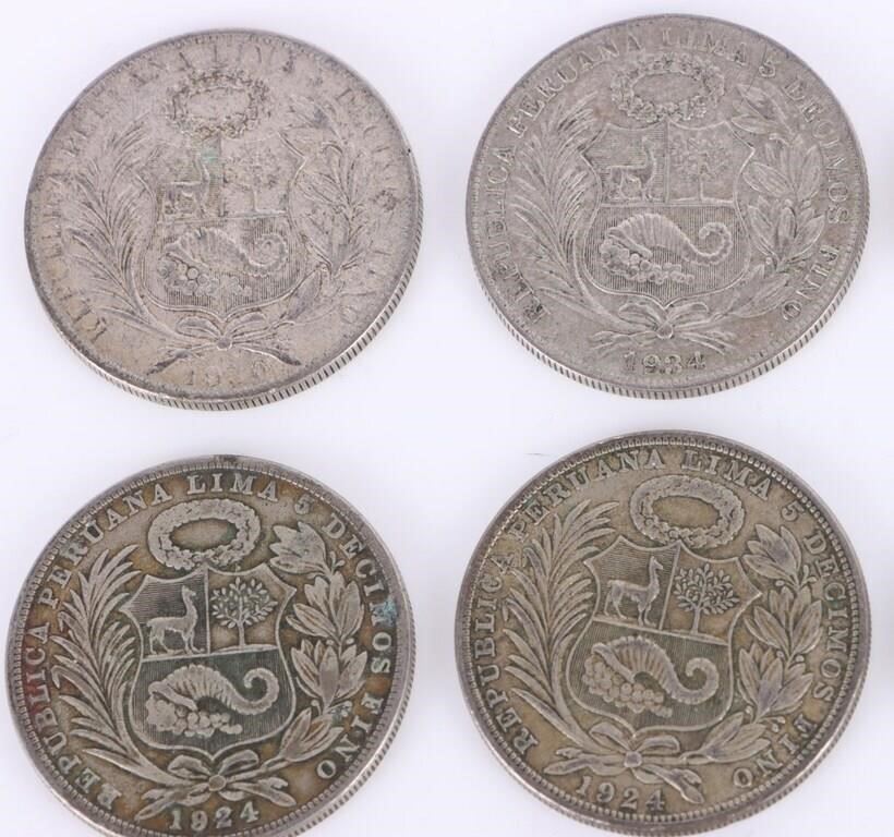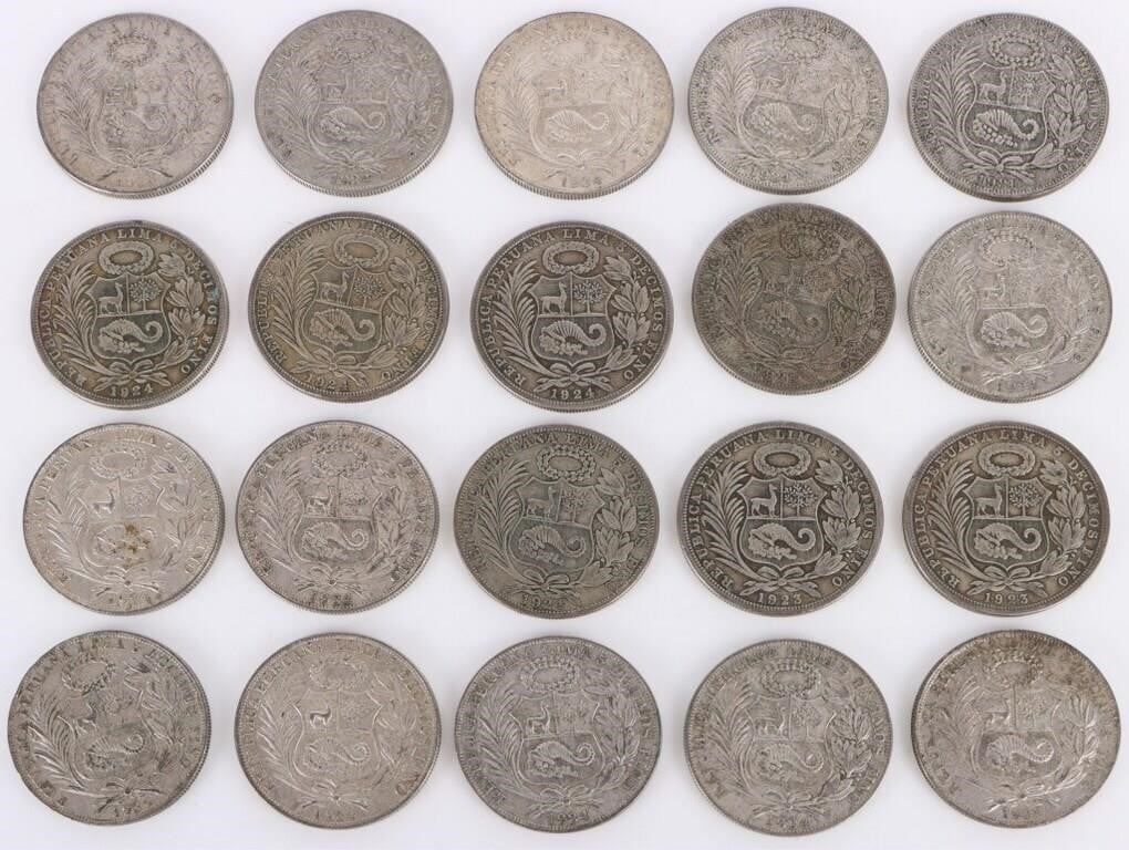 50% silver world silver coins: Peru Un Sol - lot of 20. Peruvian years include: one 1930, two 1923, four 1924, one 1925, one 1931, and eleven 1934 coins.