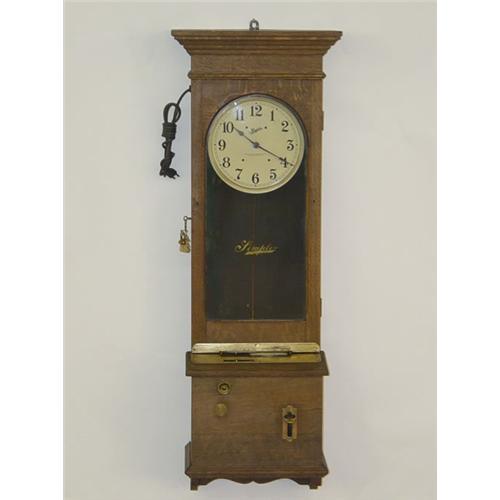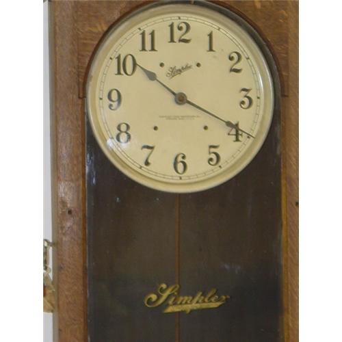 50" SIMPLEX OAK CASED TIME RECORDER WALL CLOCK W/ REVERSE ON GLASS W/ SIMPLEX LOGO-SIMPLEX TIME RECORDING CO. GARDNER MA MODEL 1223 (ELECTRIFIED) - WEAR & IMPERFECTIONS