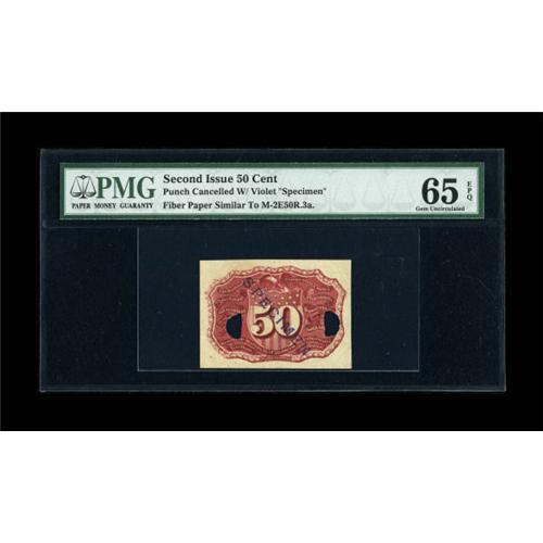 <B>50¢ Second Issue Experimental Back PMG Gem Uncirculated 65 EPQ.</B></I> Punched and stamped as these are usually found. The colors on this piece are beautiful as is the centering. It is also on heavier fiber paper with a more dense profusion of fibers than is usually seen. We have handled a number of these before, and they are generally found with problems. This beautiful note in its high-end third party holder is exceptionally nice. <BR><BR><b>Shipping:</b> Coins & Currency (<a target="_blank" href="http://www.heritageauctions.com/common/shipping.php">view shipping information</a>)