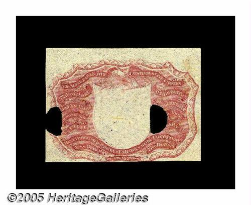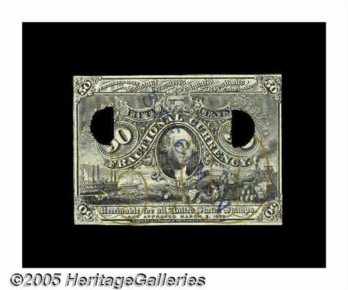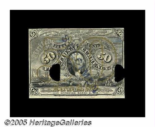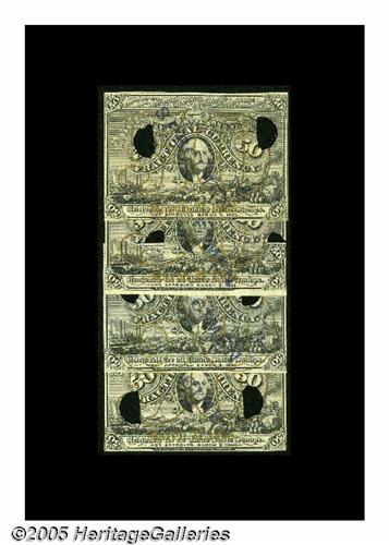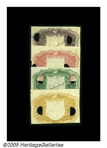 <B>50¢ Second Issue Experimental Set of Four Milton 2E50FR.2, 2b, 2c, 2d Gem New.</B></I> Very similar to the 25¢ set in the preceding lot, with the major difference, other than the denomination, being the bronze date that is overprinted on the face, which in this case is March 21, 1863. Each of these four incredible notes bears the face printing of the finished 50¢ Second Issue plate. Also on the face of each note is the large bronze "50" normally found on the back. Immediately below the "50" and also in bronze is the unexplained date "March 21, 1863." This date appears on three of the four notes. On the note with the green back, the bronze overprint is misaligned so that the "50" is printed near the bottom of the note, and the date has apparently printed below the frame line and been inadvertently omitted. All four notes have the identical engraving on the back, which is that of the normal Second Issue notes with this exception: the area within the shield where the denomination appears is blank but for the outlined stars, and those stars are double outlined on these notes. They are single outlined on the regularly issued Second Issue notes. Each of the four backs is printed in a different color. 2E50FR.2 is printed in the green used on the Ten Cent note, .2b is printed in the red used on the 50¢ note, .2c is printed in the purple used on the 25¢ note and .2d is printed in the light brown used on the Five Cent note. The .2 and the .2c both have the handwritten word "Imperfect" written inside the blank shield. All four of these spectacular rarities grade Very Choice to Gem New, and all four are fully bright. Each of the notes is an extreme rarity, ranging from unique to three known. Milt Friedberg obtained this set on February 23, 1981 for $12,000. Tom O'Mara purchased it from CAA's 1997 sale of the Friedberg Collection.