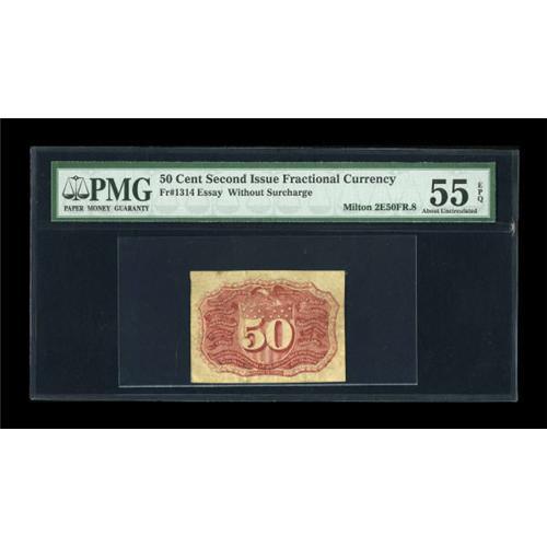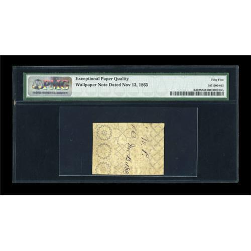 <B>Milton 2E50FR.8 50¢ Second Issue Experimental Lavender "Wallpaper" Note PMG About Uncirculated 55 EPQ.</B></I> This important and highly intriguing piece was previously Lot 16435 from our May 2005 sale of the O'Mara Collection. Prior to that, it was Lot 1067 from our January 1997 Milt Friedberg Collection Sale. It was described there, "Apparently lot 971 from the S.H.&H. Chapman February 15, 1904 sale of the Wilcox Collection. The piece was described there, '50¢ reverse as regular issue but without gilt 50, etc. reverse shows an elaborate series of designs in lavender - thick fiber paper.' This About New piece matches that description exactly, the only exception being that the Chapman sale makes no mention of contemporary writing on the 'wallpaper' side, 'W.P. 1863 Nov 13, 1863.' This lavender design was seen on a larger sheet of paper by Milt Friedberg at one point. He believes it to be a border design that surrounds an engraving of the Treasury Department building. If this is the Chapman example, the note is likely unique; if it's a different example, then two are now known. As an uncanceled, unstamped 50¢ back Experimental, it would be of major importance even without its intriguing 'face.'" <I>Denly's of Boston to Milt on April 1, 1985; MRF CAA 1/97 Lot 1067. O'Mara CAA 5/05 Lot 16435.<BR></B></I><BR><BR><b>Shipping:</b> Coins & Currency (<a target="_blank" href="http://www.heritageauctions.com/common/shipping.php">view shipping information</a>)