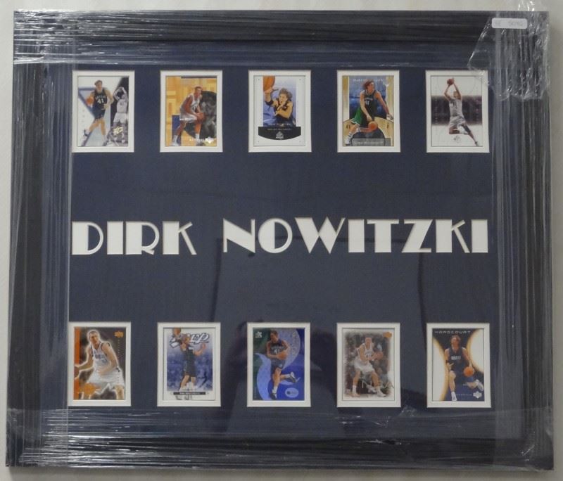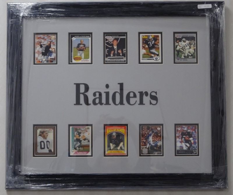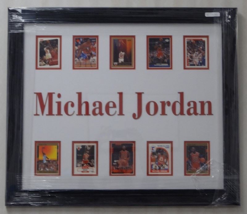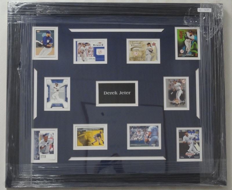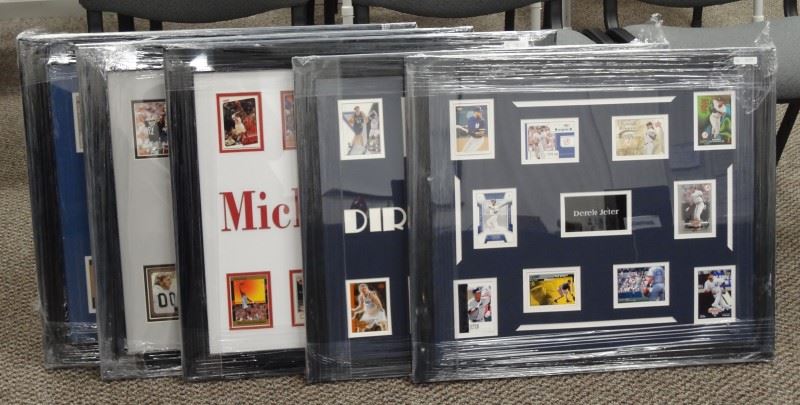 EACH FRAMED 27" x 24". THE CUBS 10 CARDS, RAIDERS 10 CARDS, MICHAEL JORDAN 10 CARDS, DEREK JETER 10 CARDS, AND DIRK NOWITZKI 10 CARDS. VERY NICE LOT.