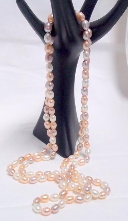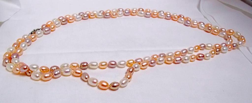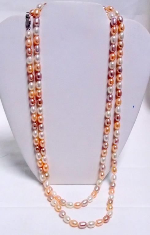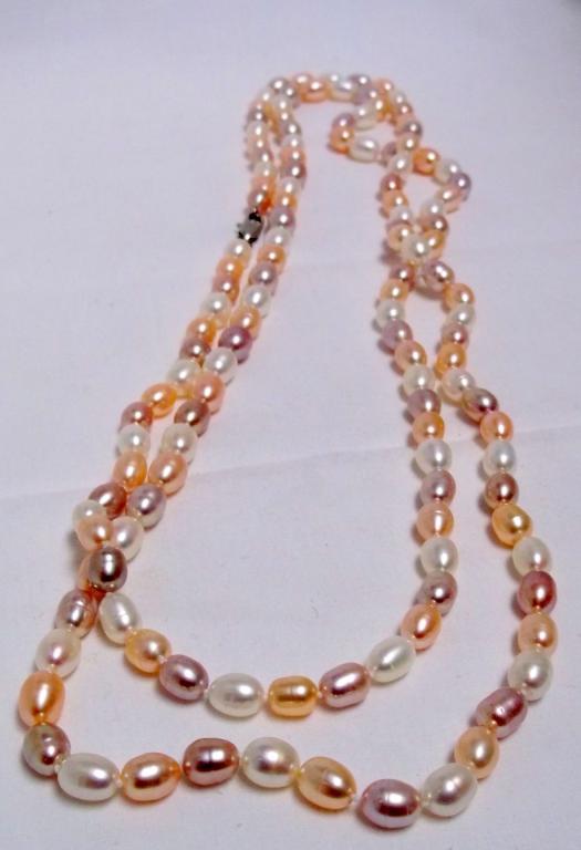 This is a real beauty!! A full fifty inches of gorgeous tri colored 10mm rice pearls with a retail value of $1488-.