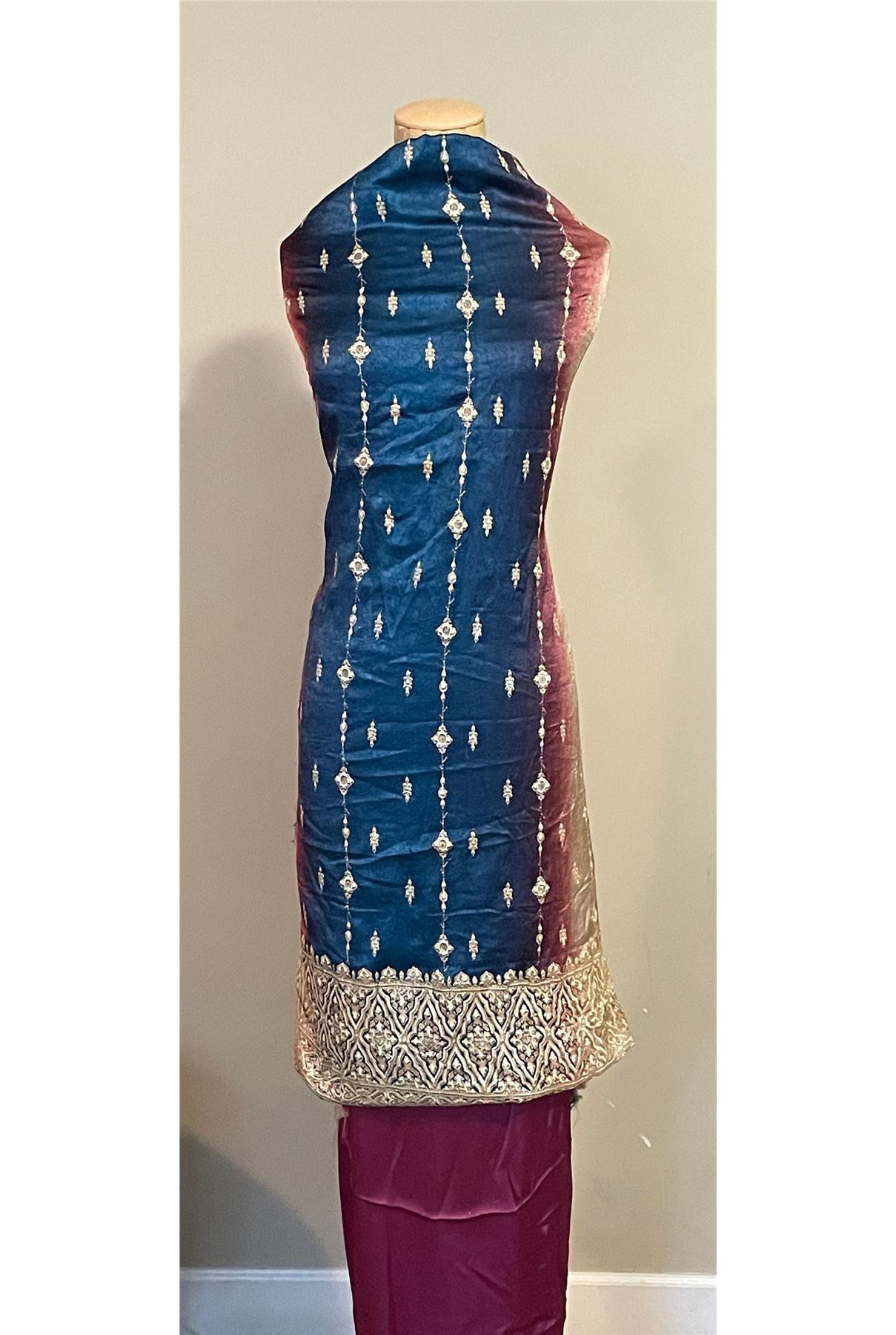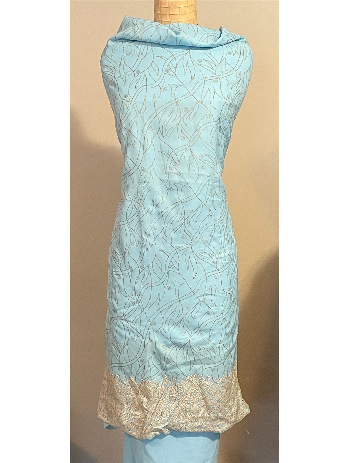 Women’s unstitched suit material with hand block foil design. High quality crepe or satin material in 2 or 3 piece, Each suit set is made up of