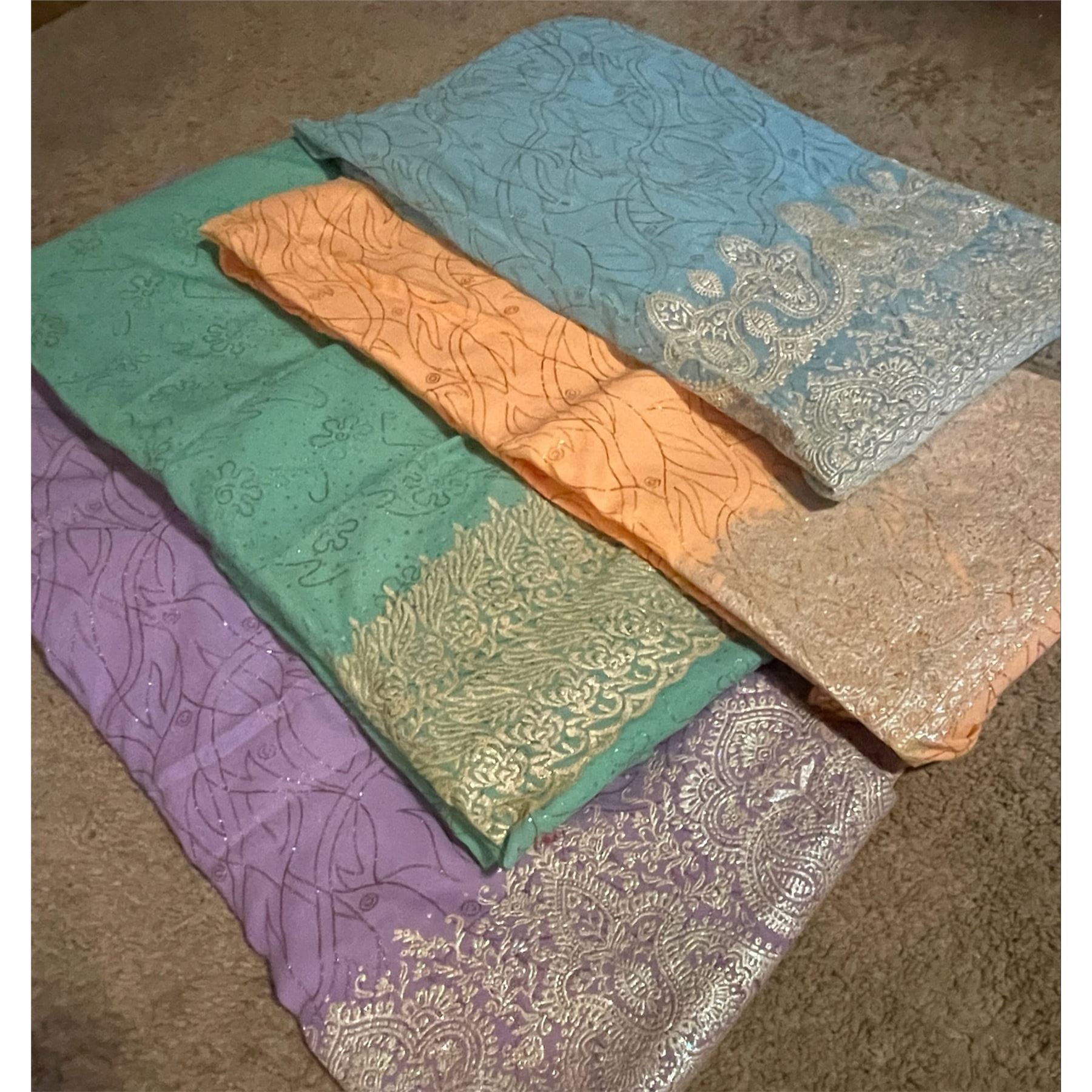 Women’s unstitched suit material with hand block foil design. High quality crepe or satin material in 2 or 3 piece, Each suit set is made up of
