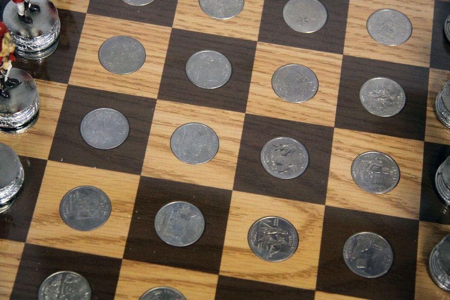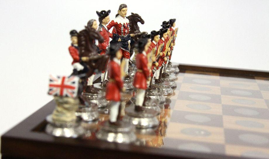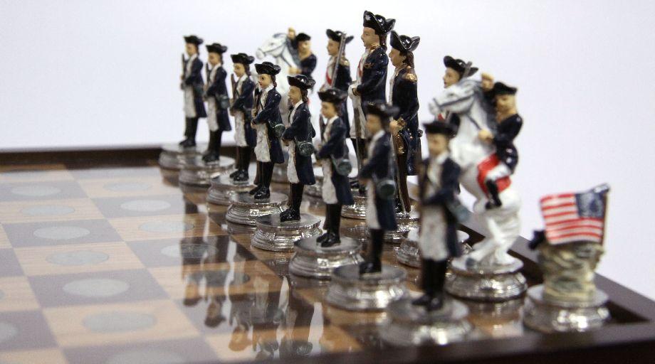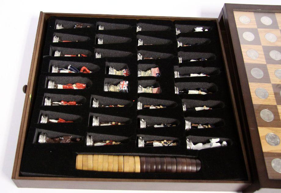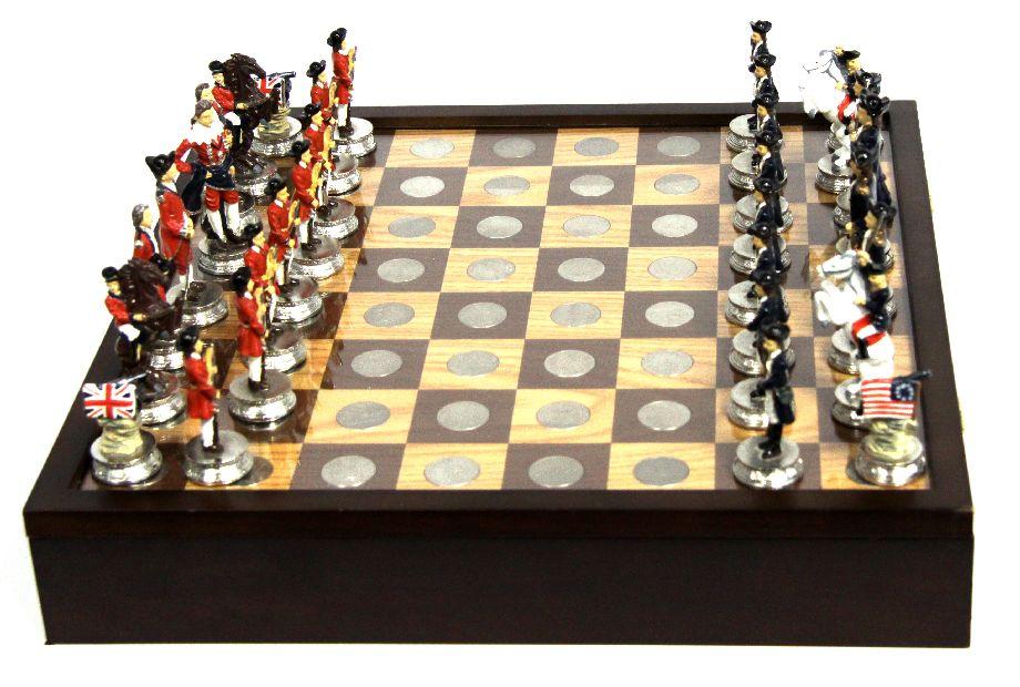 15.5 x 15.5 x 3 inch chess and checker board set displaying all 50 state quarters from 1999-2008 in brilliant, UNC condition. Complete with hand-painted pewter Revolutionary war chess figurine pieces and solid wood Betsy Ross Historical Flag & British Flag checker pieces. The display case/board has some minor knicks to the wood and the handle to the drawer is loose, but overall the set appears to be in very good condition.