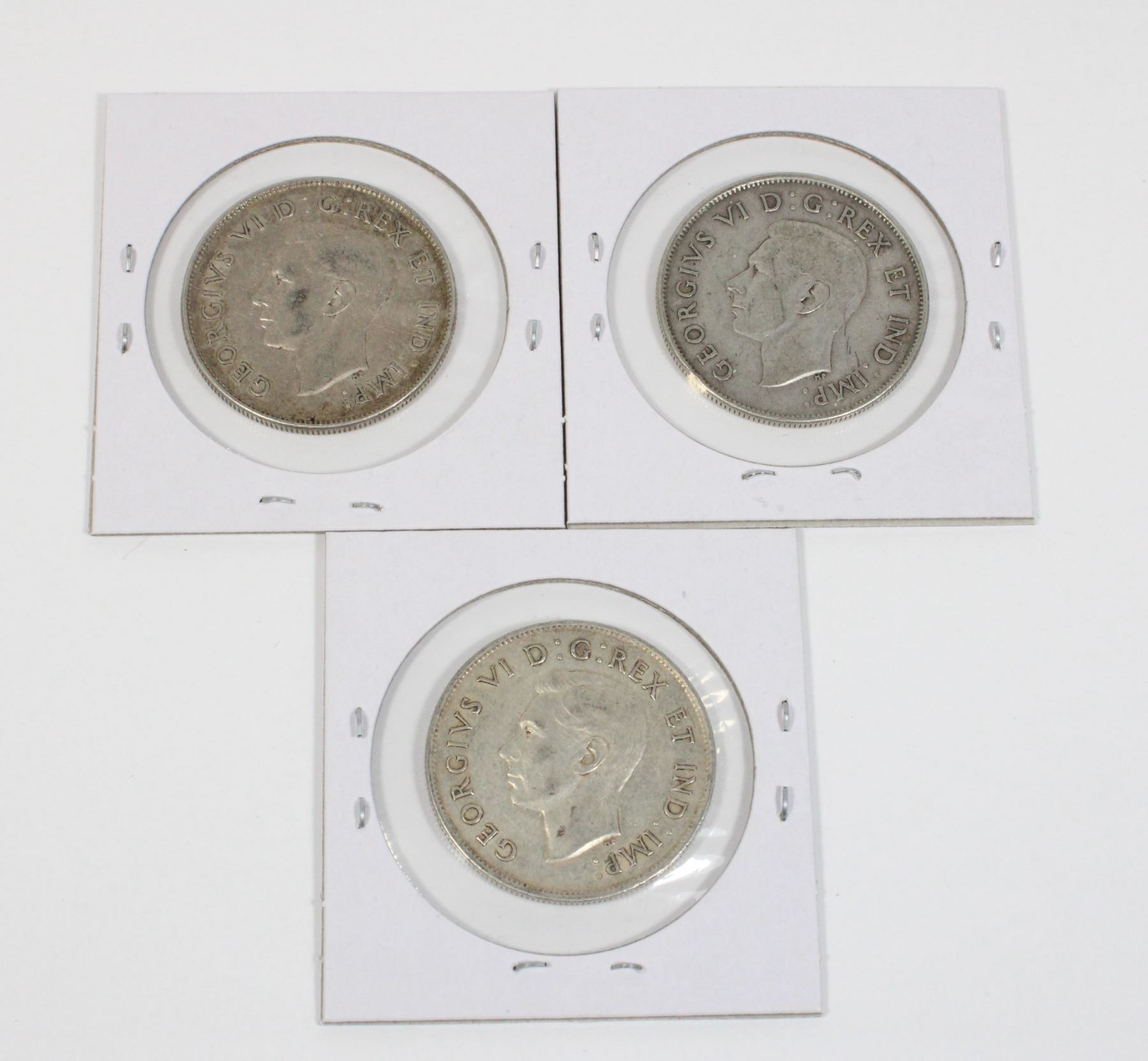 LOT OF 3 WW2 WORLD WAR TWO ERA 1943 SILVER 50 CENT HALF DOLLAR COINS KING GEORGE VI CANADA CANADIAN SILVER CURRENCY SILVER 50 CENT HALF DOLLAR COINS