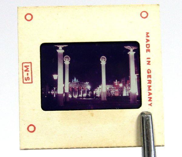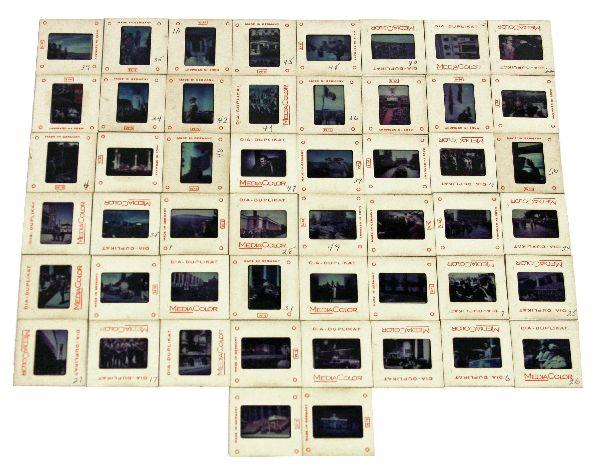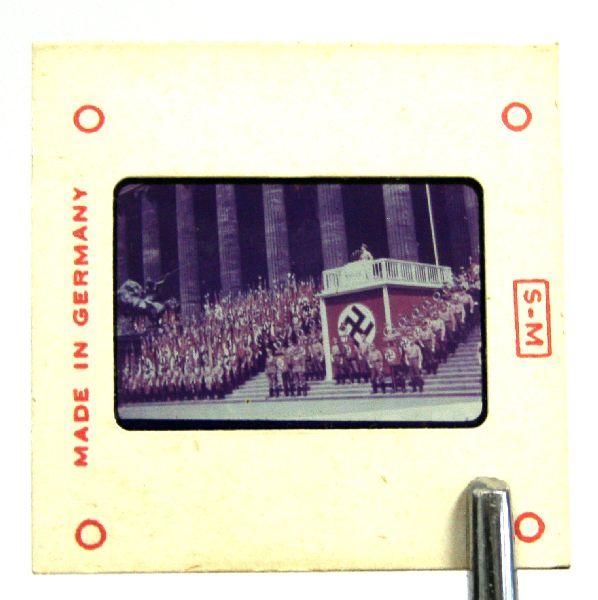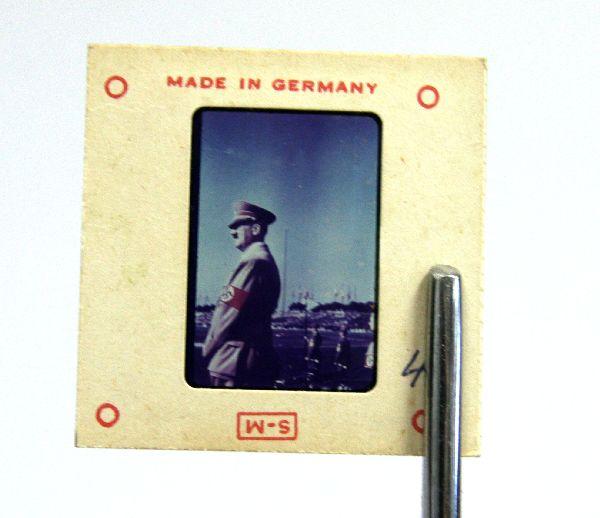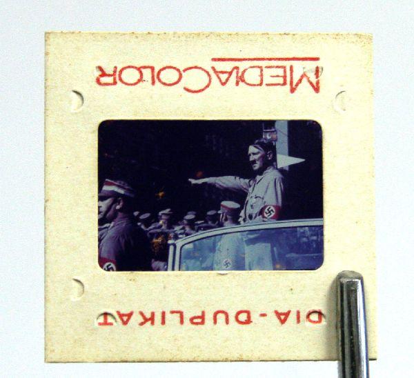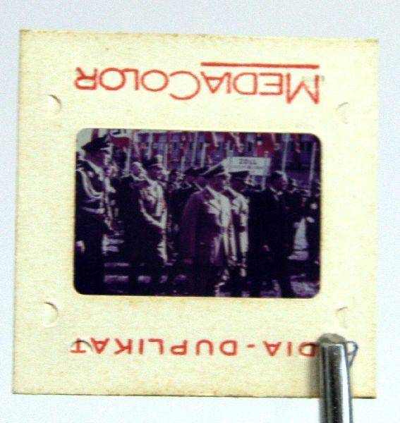 Color projector slides of pictures appearing to be original unpublished WWII Germany. Photos appear to be amateur, not professional, with pictures of Hitler and other high ranking individuals, as well as street scenes, parades, and rallys. Slides are marked "Dia-Duplikat", and "Made in Germany". Full color. 50 slides in all. Overall very good condition.