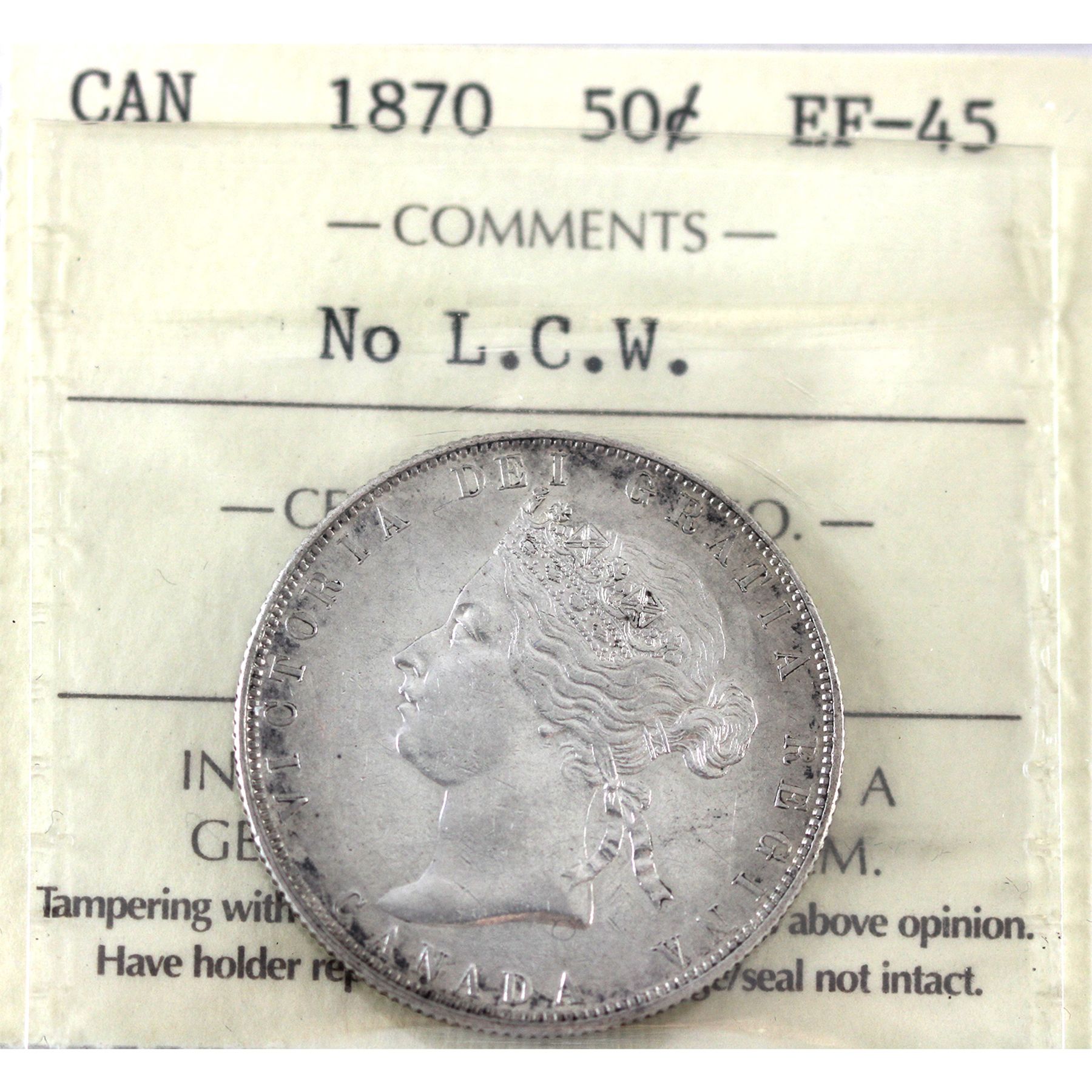 This, the rarer variation among the inaugural issue of Canadian 50-cent pieces, lacks engraver Leonard C. Wyon’s initials on the Queen’s neckline. Lustre yet glints among the devices. The silver is bright and the engraving is clear: an early Canadian coinage treasure.