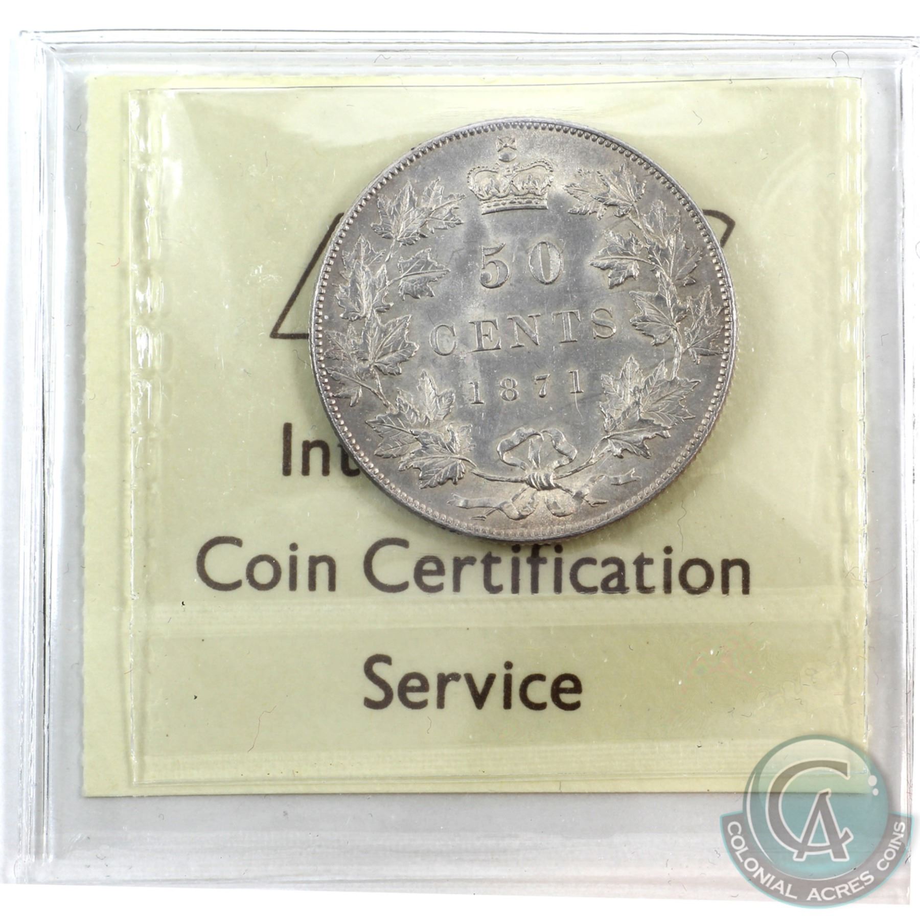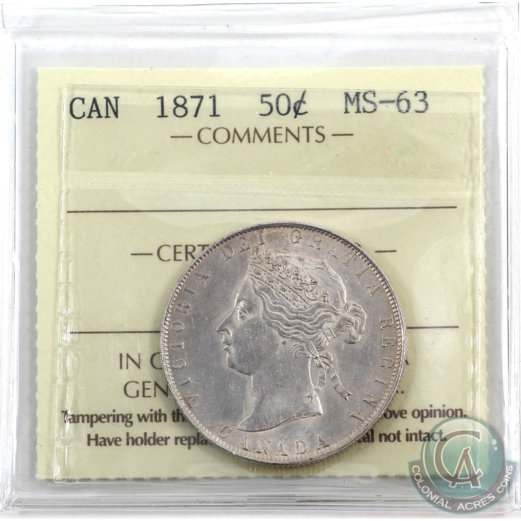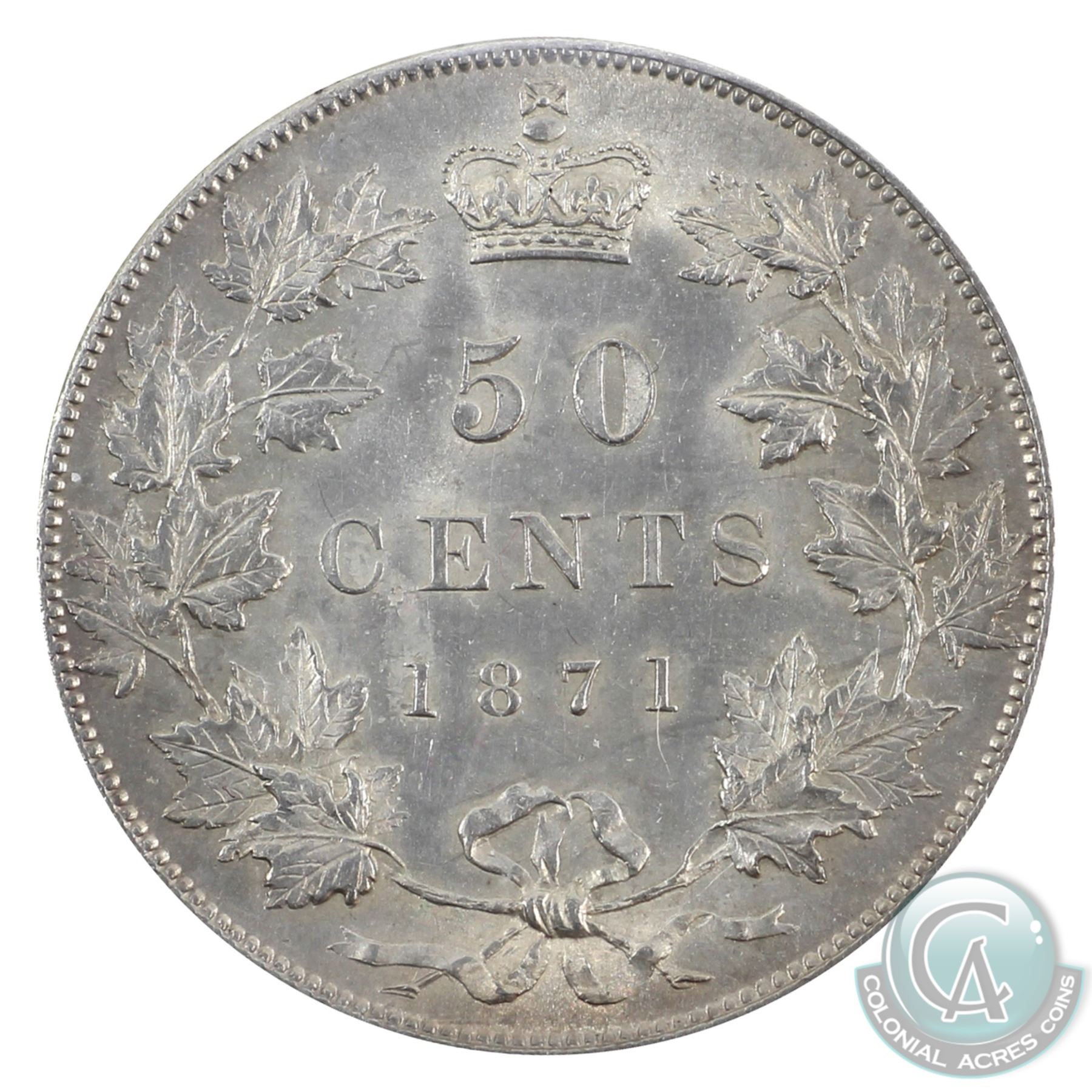 50-cent 1871 ICCS Certified MS-63. A Rare Mintstate example of this Victorian 50-cent coin is tied for the 2nd highest grade by ICCS with possibly only 1 coin graded higher. (possibly less than 20 Mint state examples gradeed by ICCS) The coin has a soft satin like finish with no distracting marks and a very consistant colour throughout both obverse and reverse. A very choice coin with great eye appeal worth a premium bid! Good Luck!
