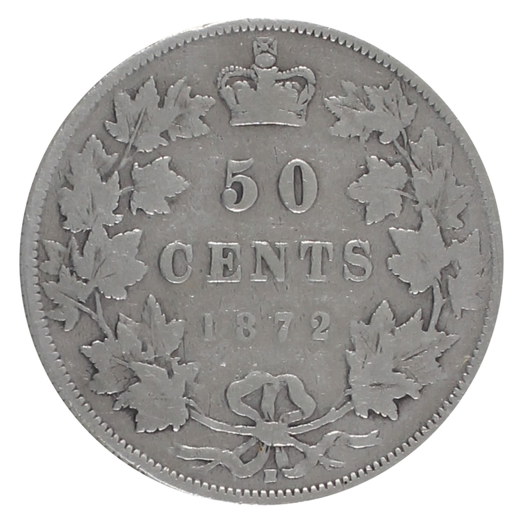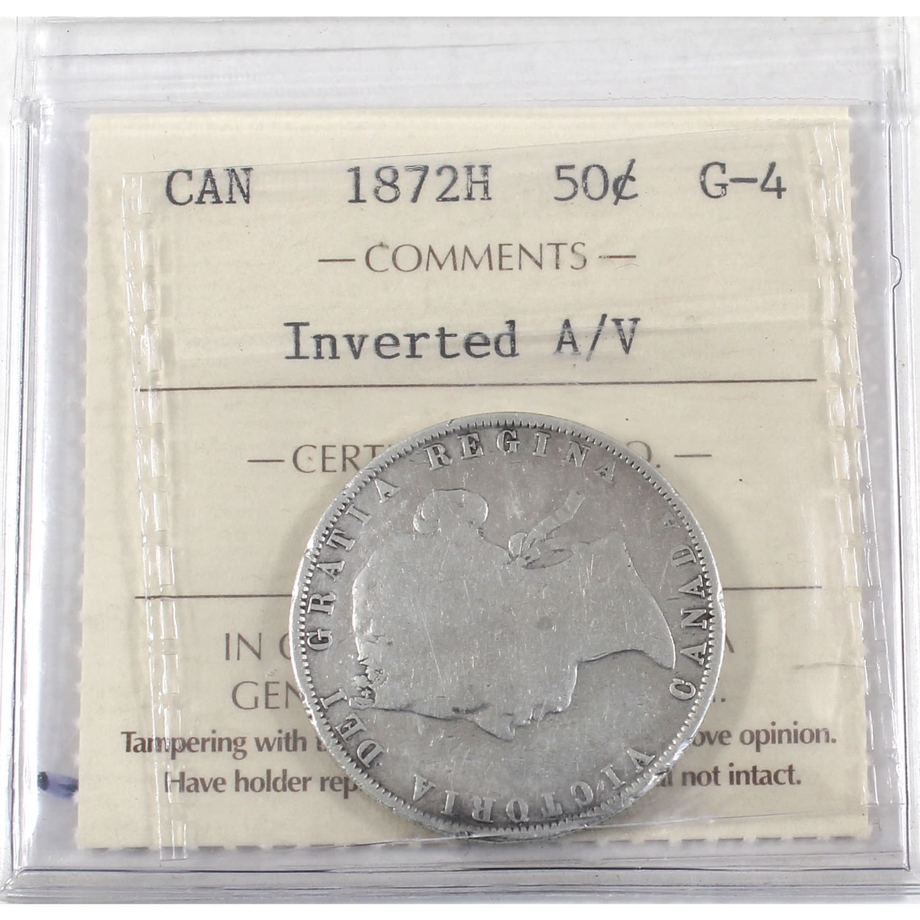 50-cent 1872-H Inverted A/V ICCS Certified G-4. Full Date and lettering with some small rim bumps.