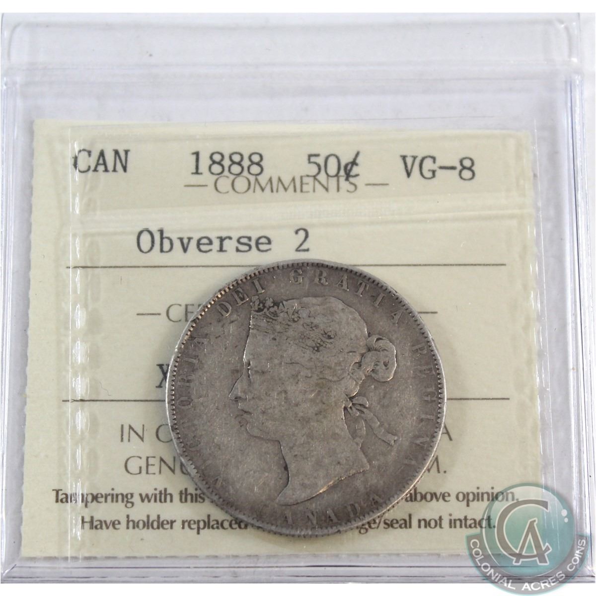 50-cent 1888 Obverse 2 ICCS Certified VG-8. *Semi Key Date*