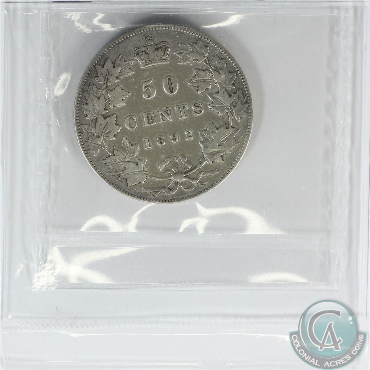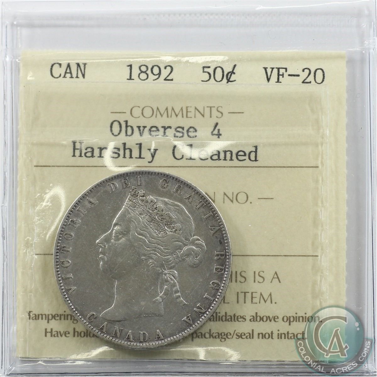 50-cent 1892 Obverse 4 ICCS Certified VF-20 (harshly cleaned). Coin has been rubbed but still has an overall attractive look.