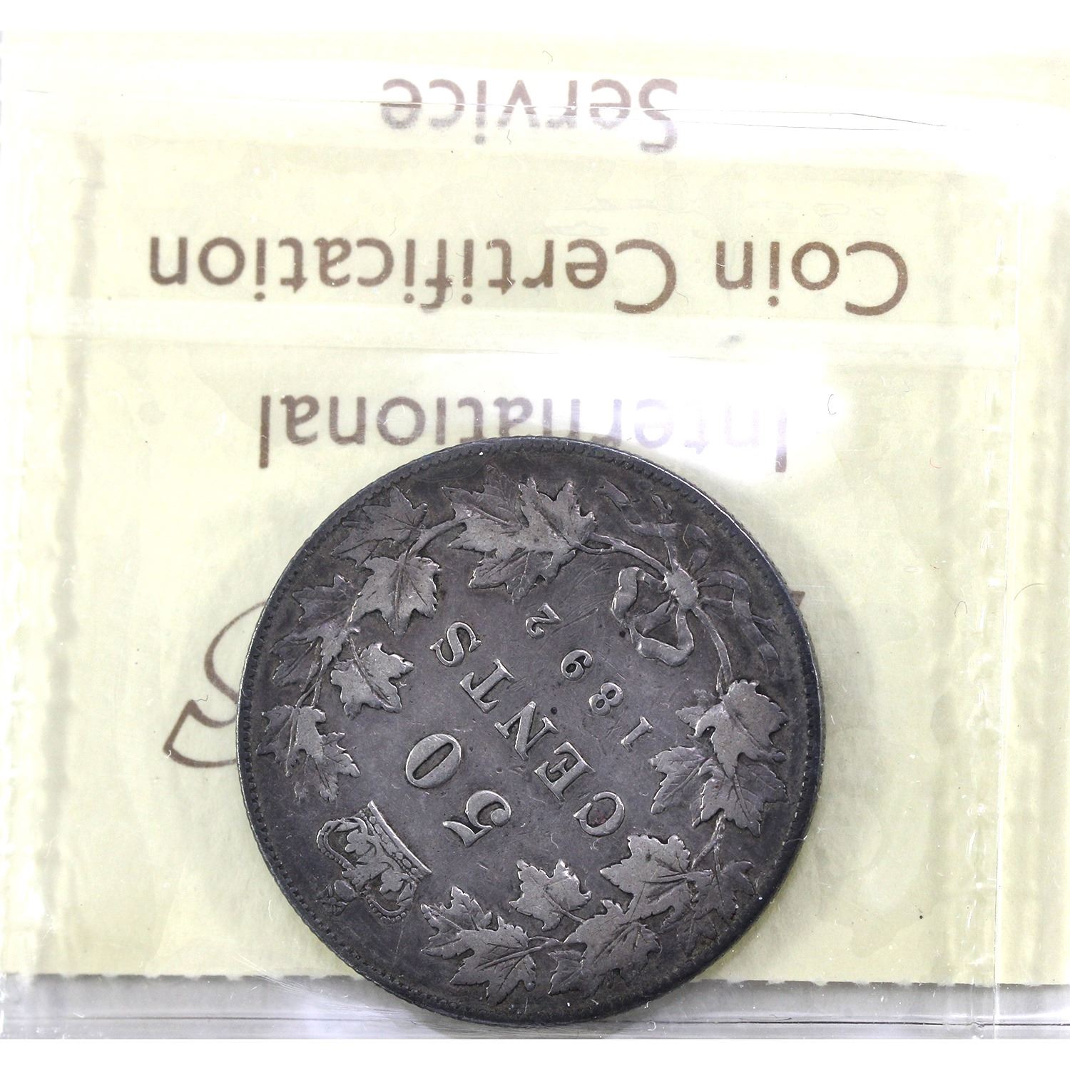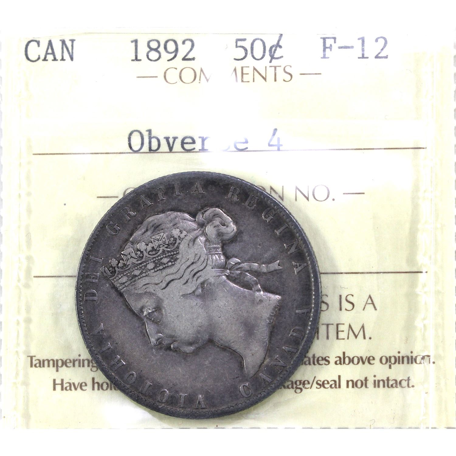 50-cent 1892 Obverse 4 ICCS F12. Pleasing, Rich Lilac Patina