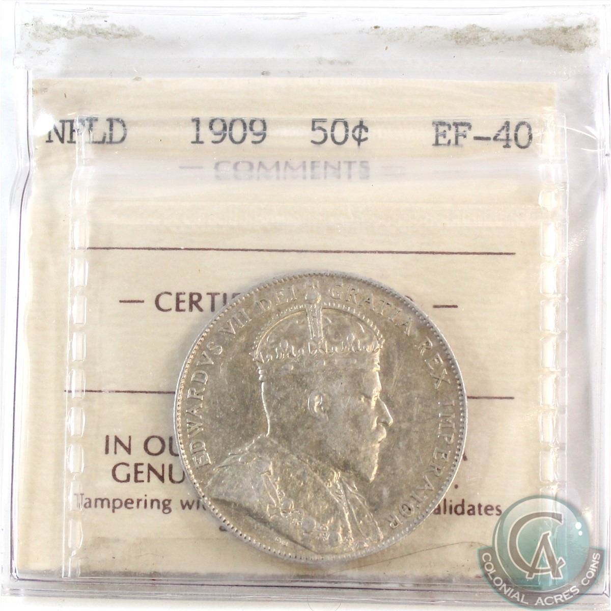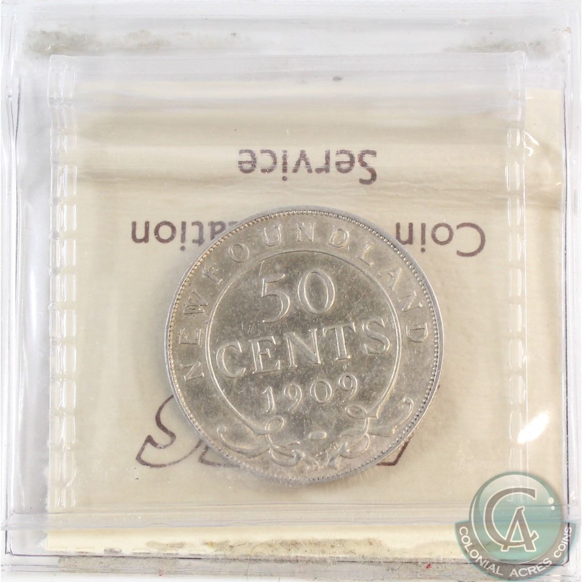 50-cent 1909 NFLD ICCS Certified EF-40 (In old embossed 2 letter holder). Note: ICCS Holder is bent and has some residue.