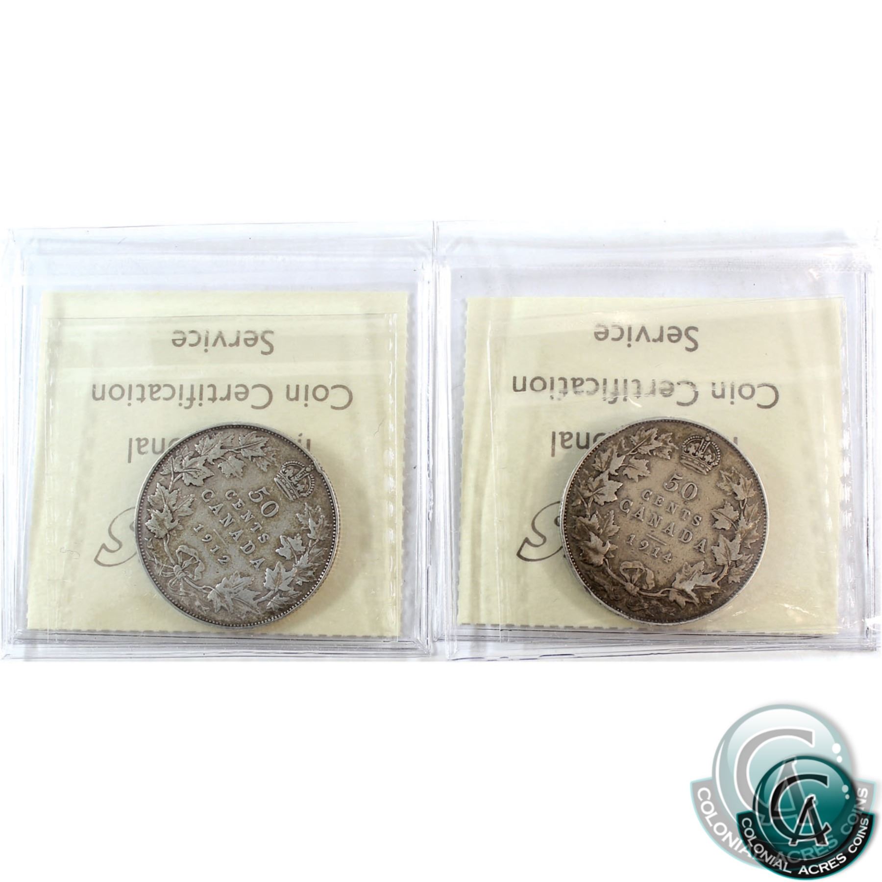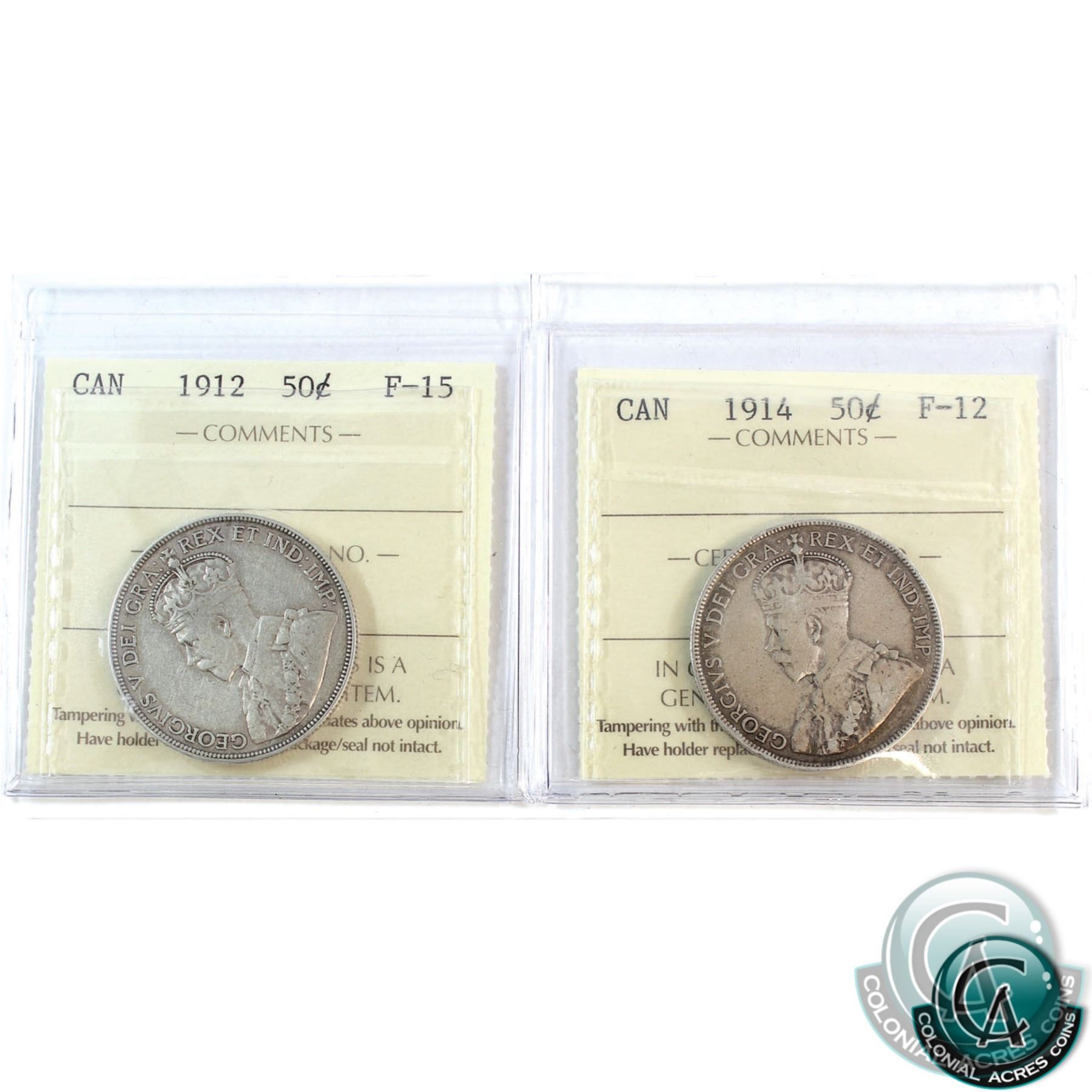 50-cent 1912 F-15 & 1914 F-12 ICCS Certified. A nice pair of even, medium tone coins. 2pcs.