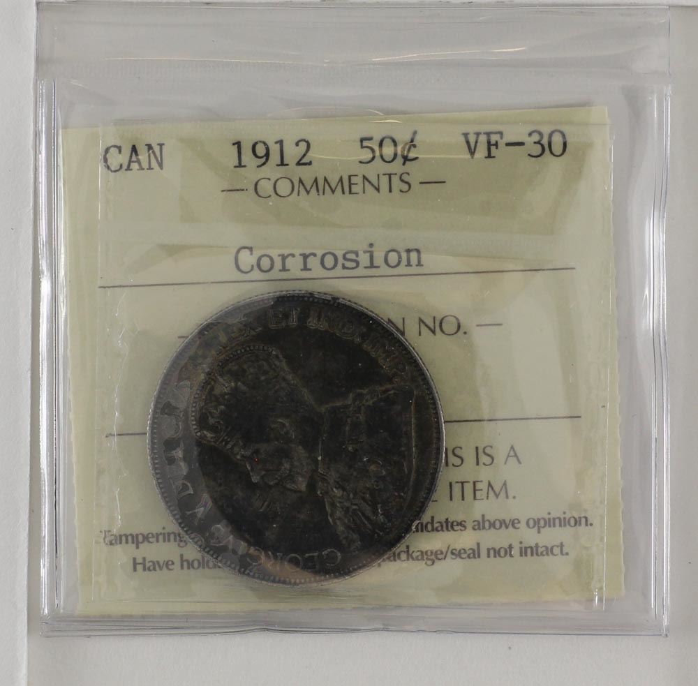 50-cent 1912 ICCS Certified VF30 'corrosion'. This is a dark grey/black coin, reverse is lighter with attractive details.