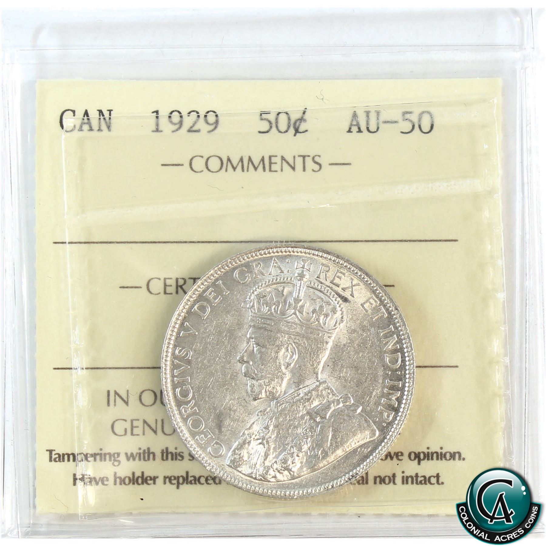 50-cent 1929 ICCS Certified AU-50. A bright flashy coin with hints of golden toning.