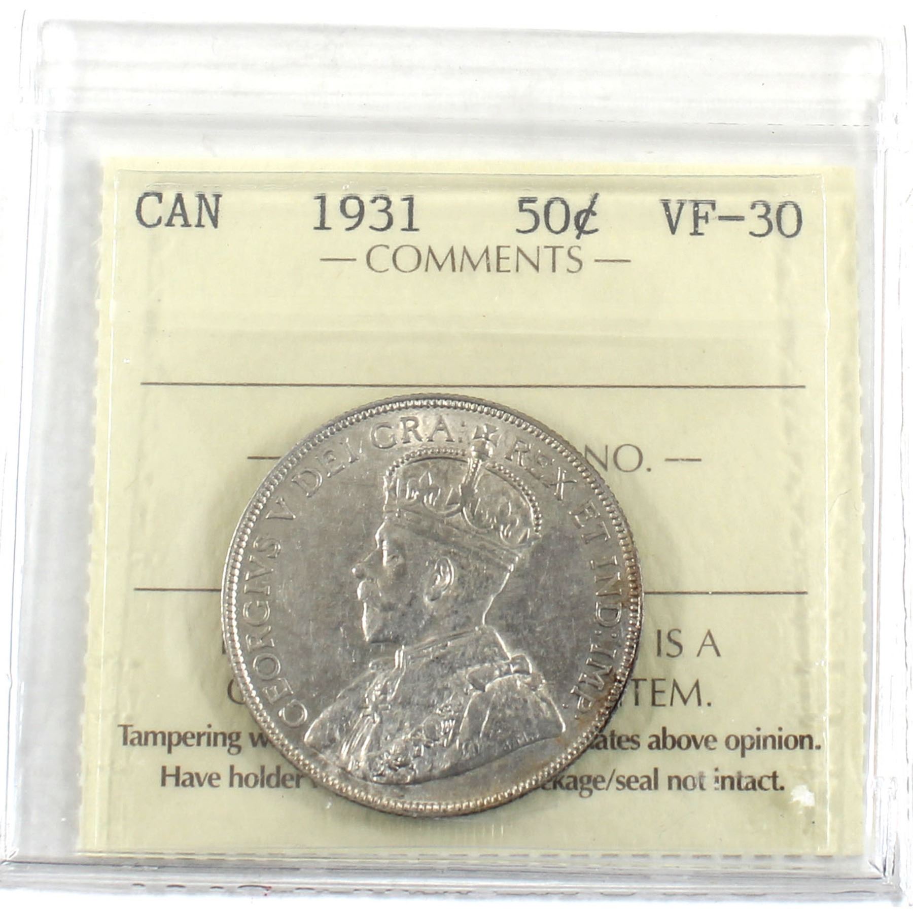 50-cent 1931 ICCS Certified VF-30. A great mid-grade coin with hints of mint luster.