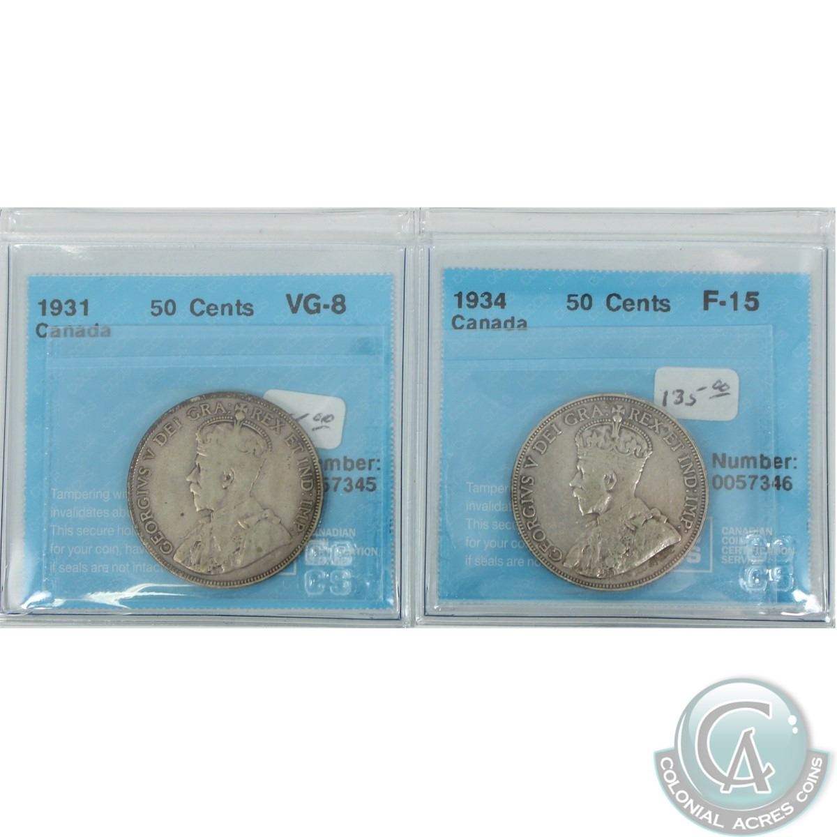 50-cent 1931 VG-8 & 1934 F-15 ICCS Certified. 2pcs