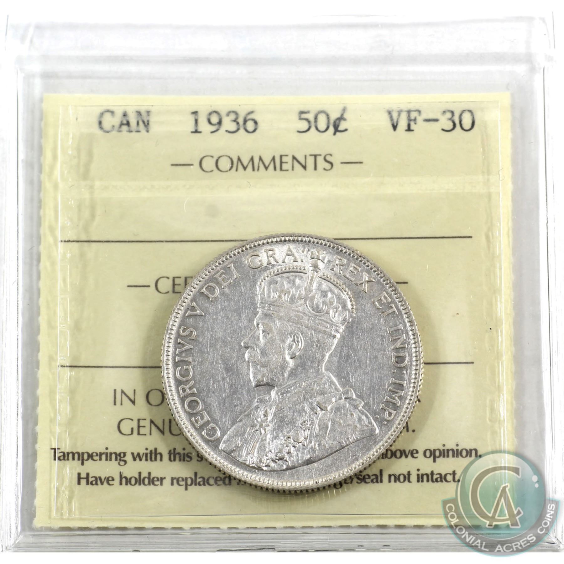 50-cent 1936 ICCS Certified VF-30. A Nice mid-grade example of this semi-key date issue.