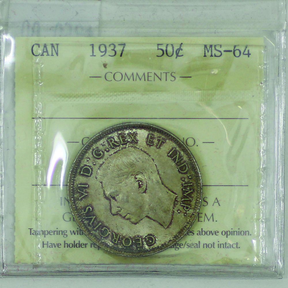 50-cent 1937 ICCS Certified MS-64. Nice mint bloom accented with deep tones.