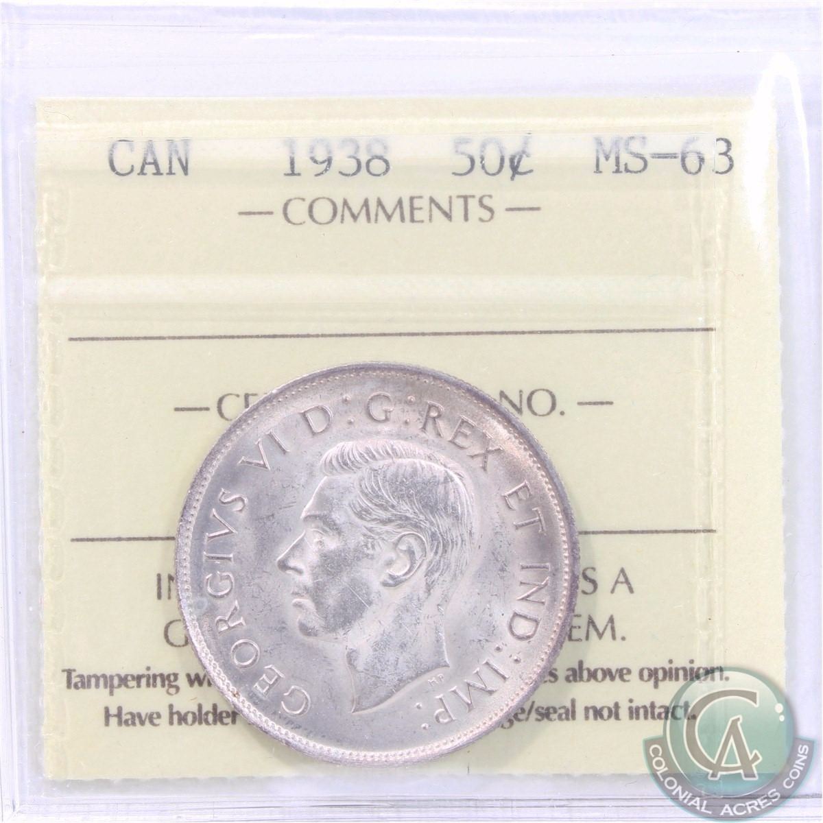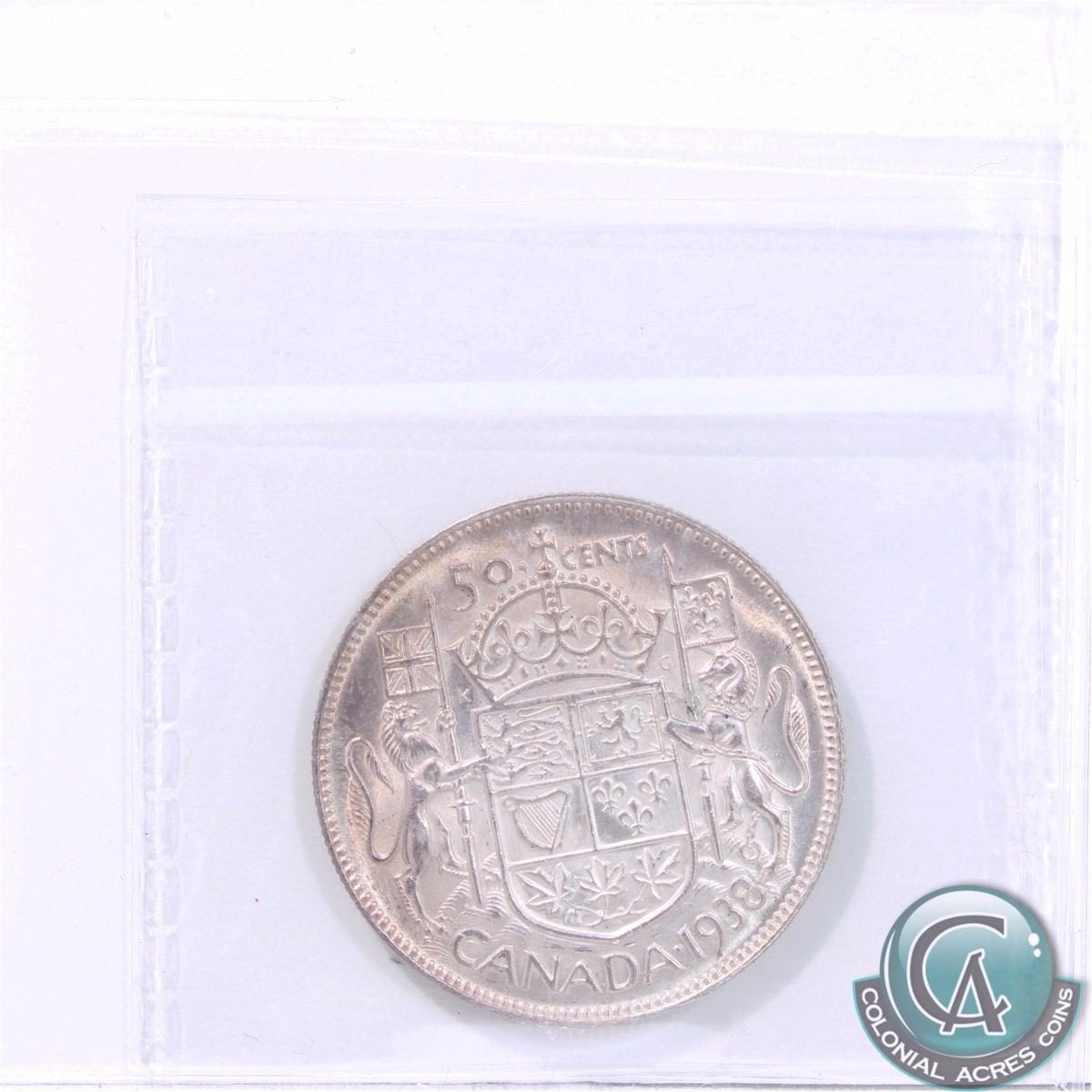 50-cent 1938 ICCS Certified MS-63. Soft Frosty fields accented with attractive light toning. Choice eye appeal coin that shows better than the grade.