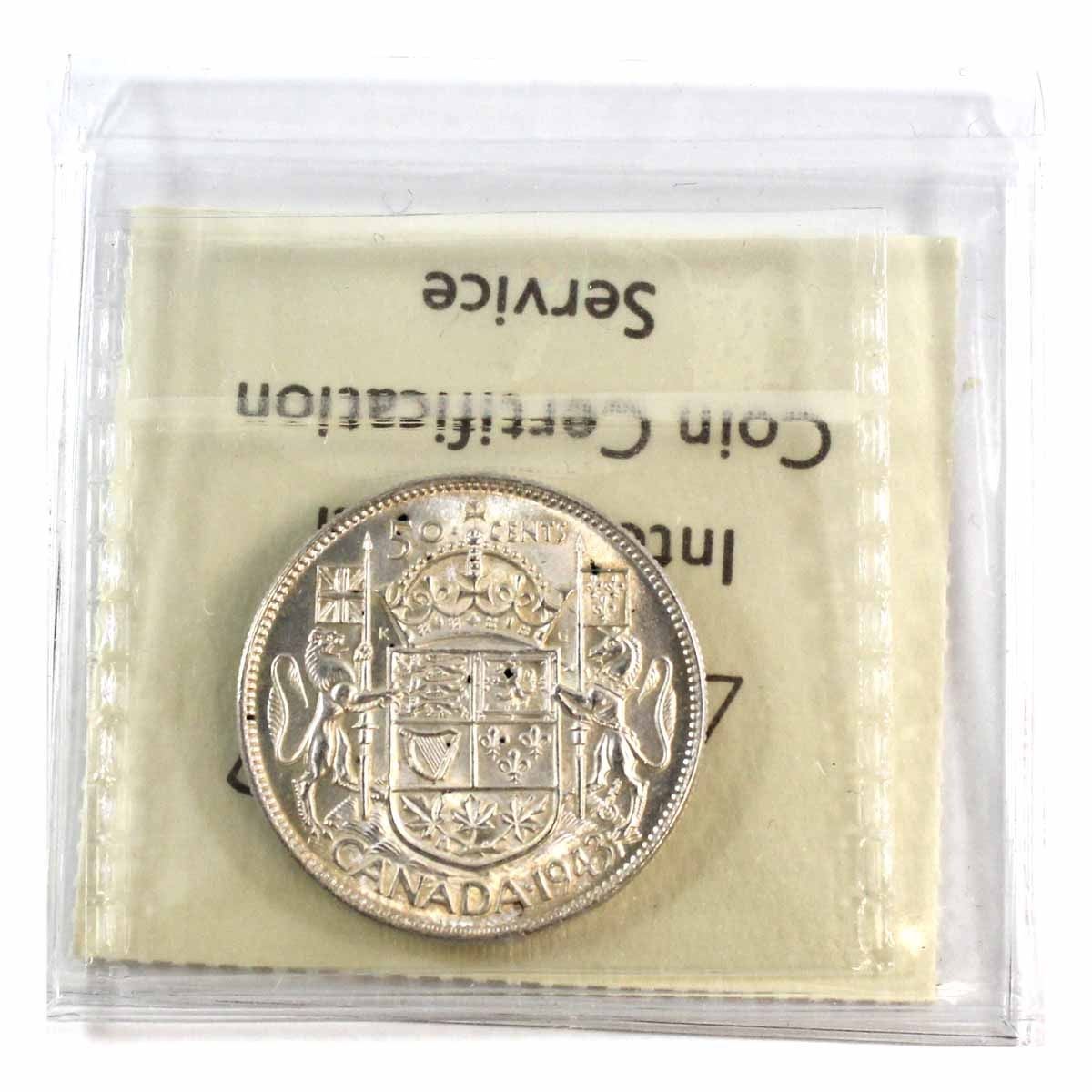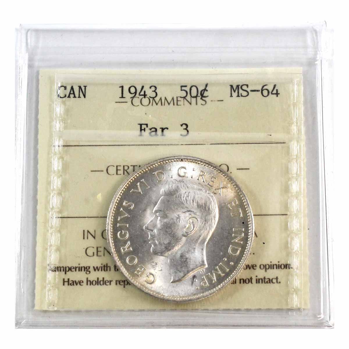 50-cent 1943 Far 3 ICCS Certified MS-64. Soft mint bloom fields.
