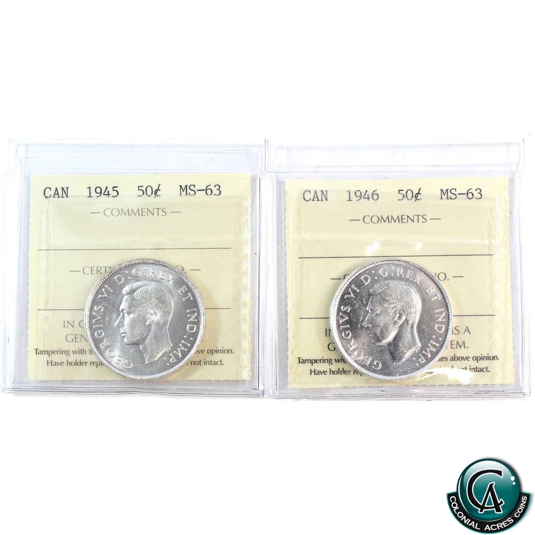 50-cent 1945 & 1946 ICCS Certified MS-63. 2pcs.