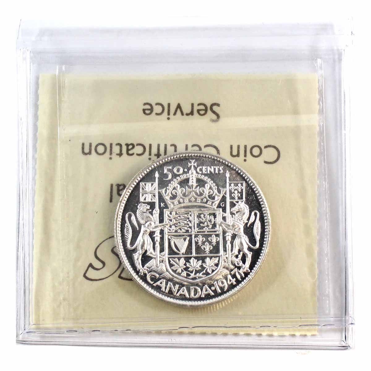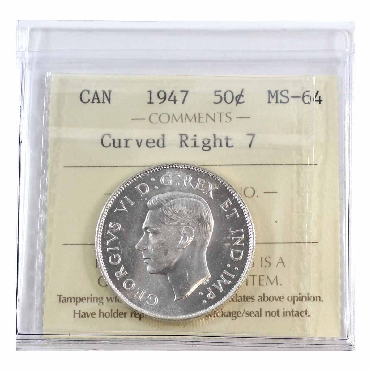 50-cent 1947 Curved Right 7 ICCS Certified MS-64. An attractive coin with lots of mint luster.