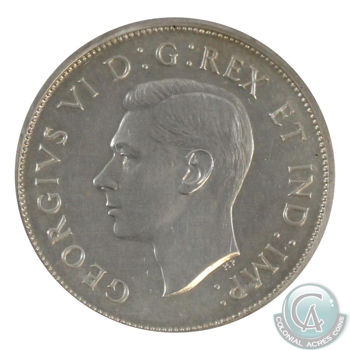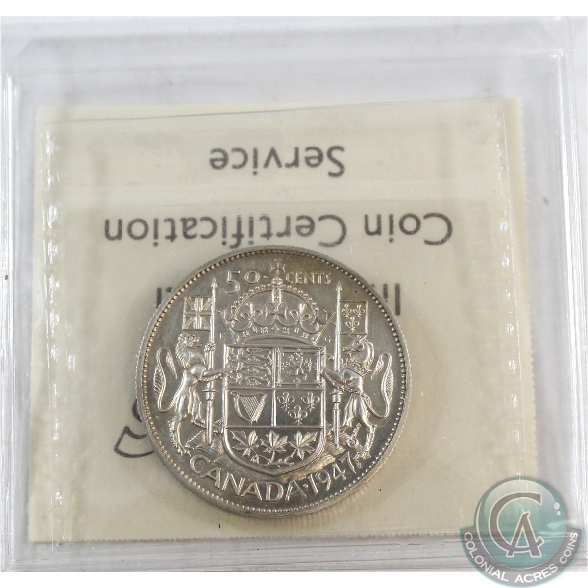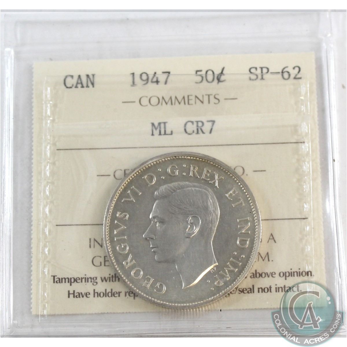 50-cent 1947 Maple Leaf; Curved 7 ICCS Certified SP-62. A flashy coin with hints of golden toning.