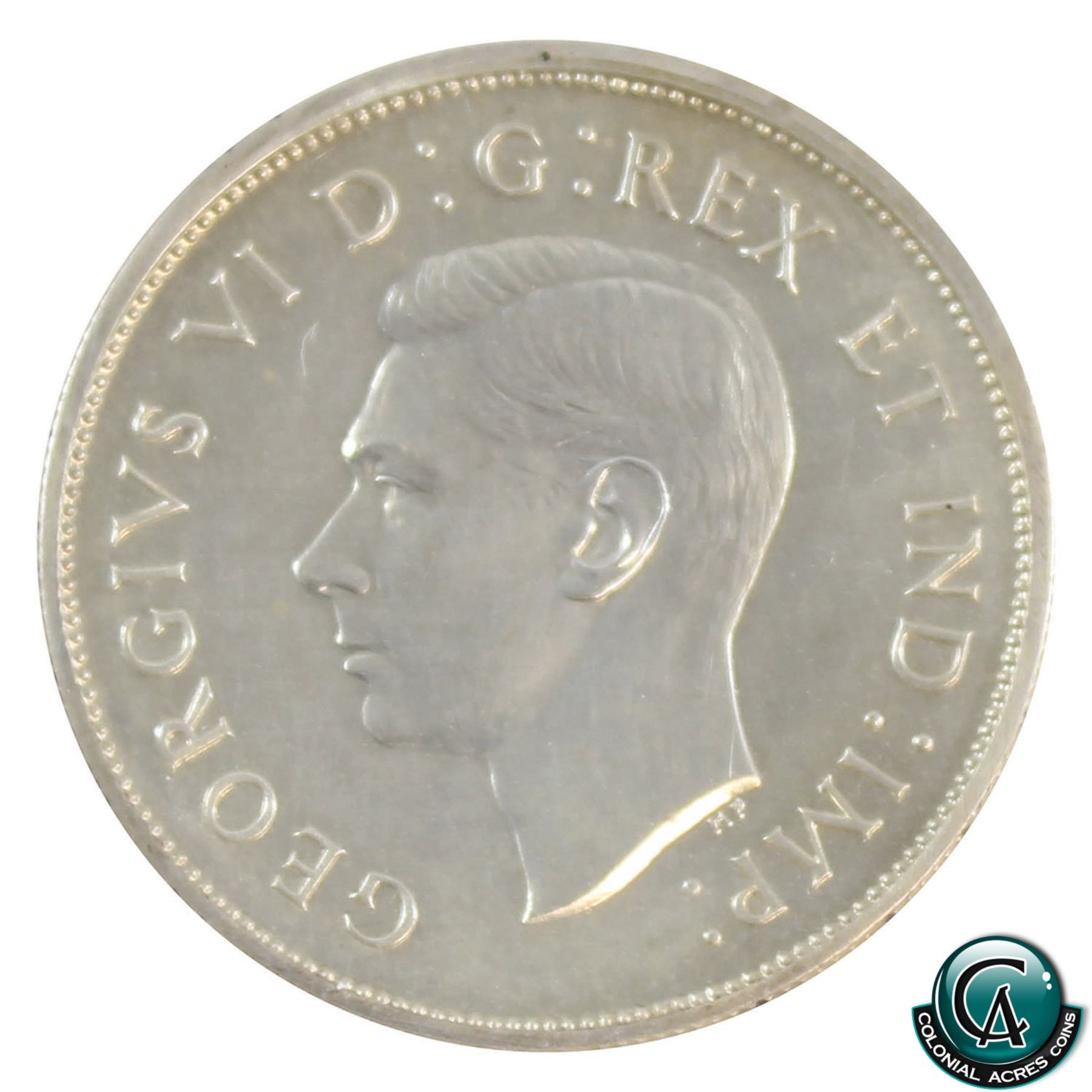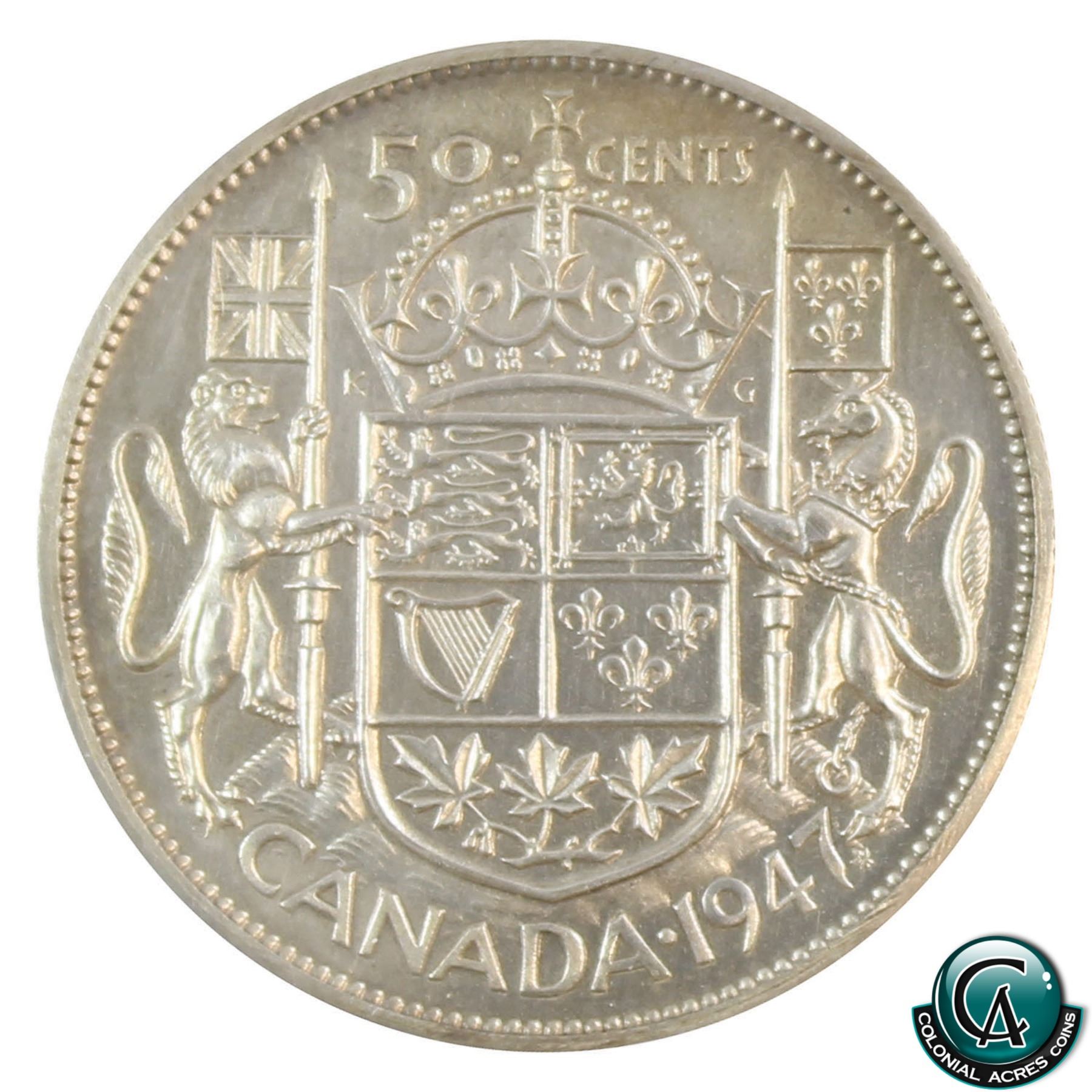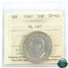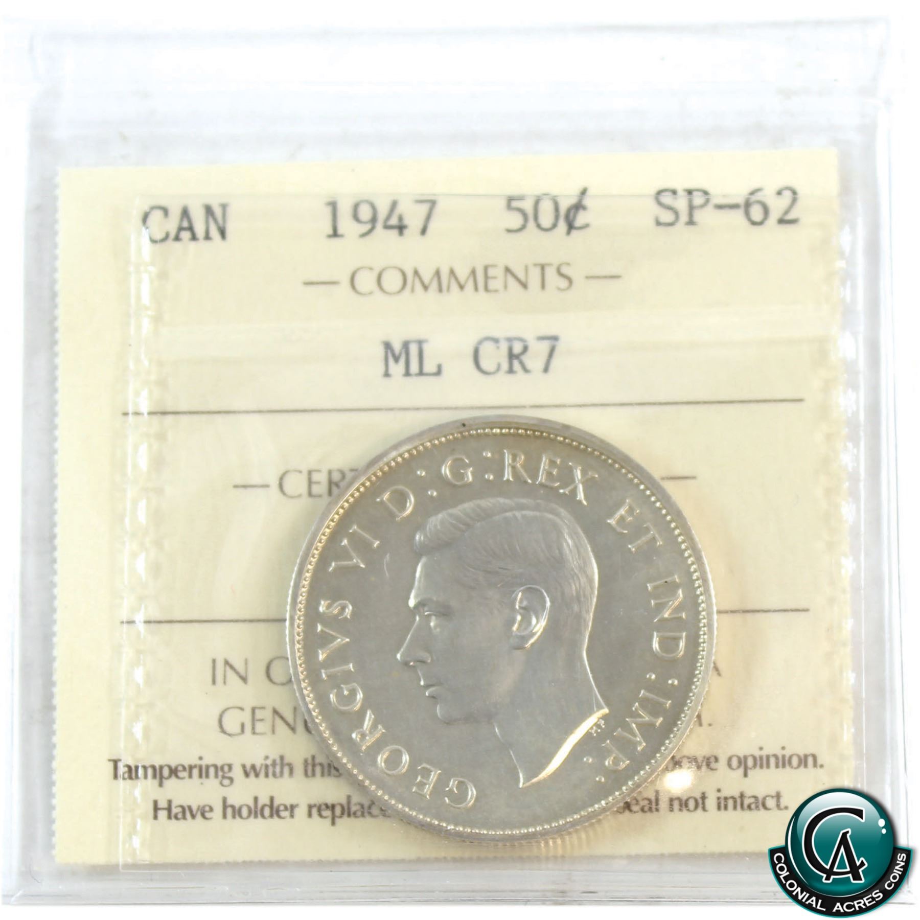 50-cent 1947 Maple Leaf Curved 7 ICCS Certified SP-62. A flashy coin with hints of golden toning.