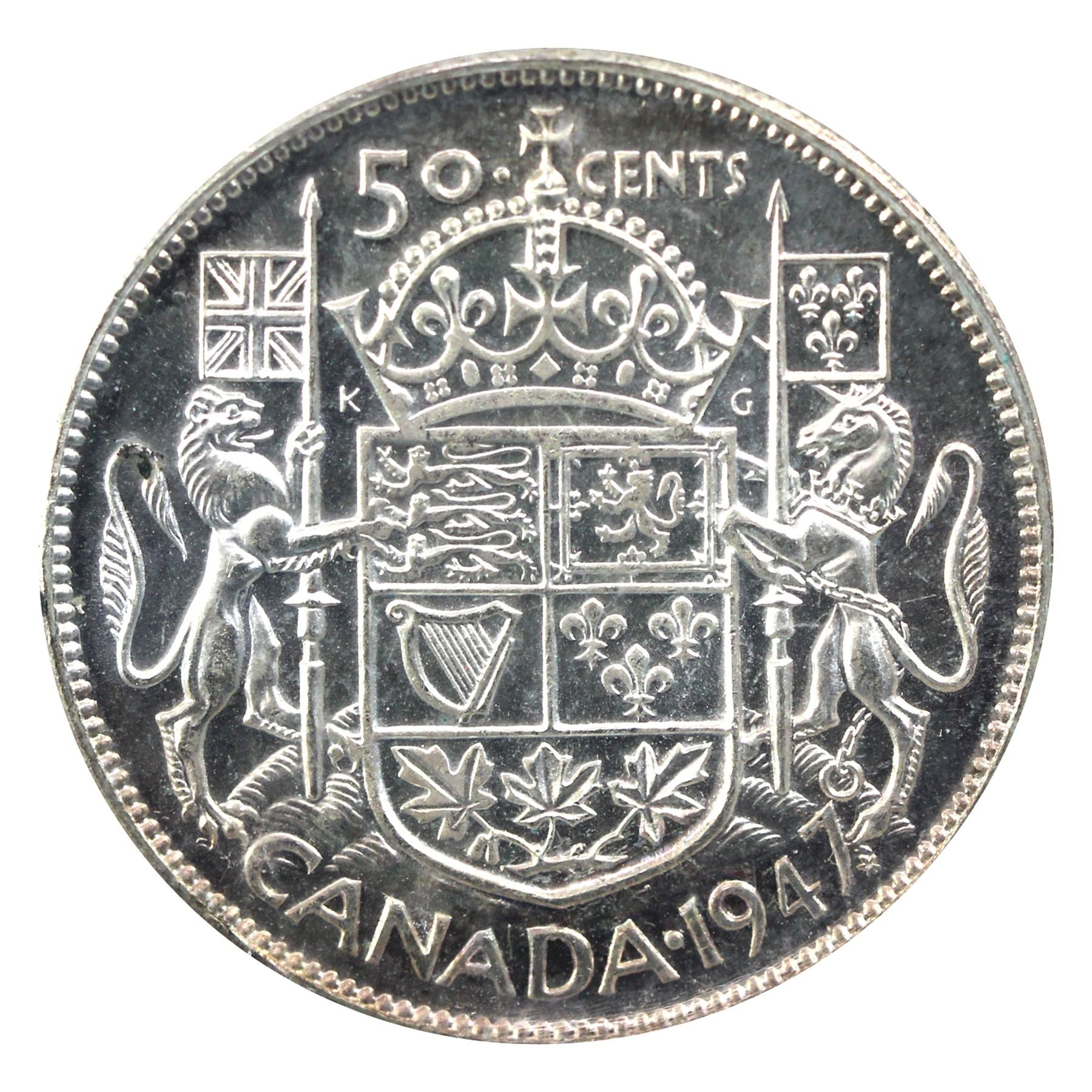 50-cent 1947 Maple Leaf ICCS Certified MS65. In old embossed 2 letter holder. An exceptionally stunning coin with hints of golden toning accenting near flawless fields.