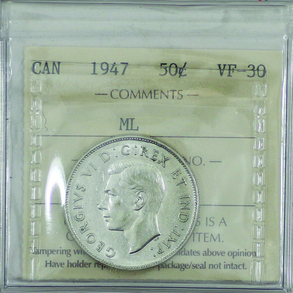 50-cent 1947 Maple Leaf variety ICCS Certified VF-30