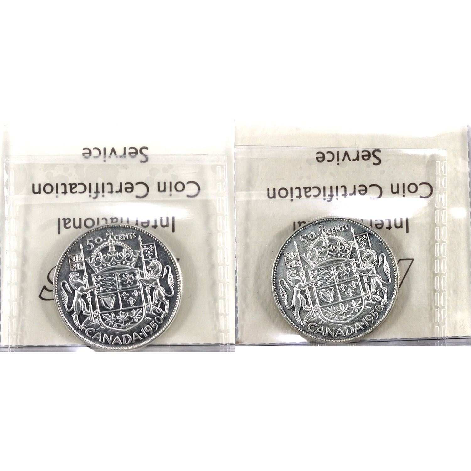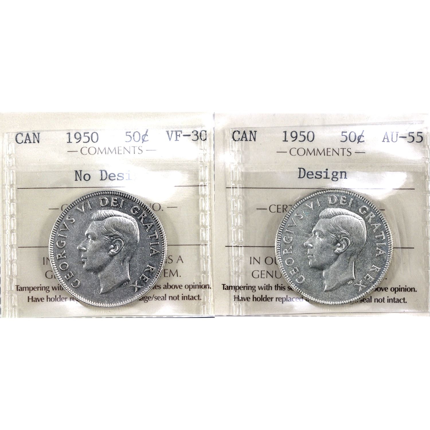 50-cent 1950 Design AU55 & 1950 No Design VF30 ICCS Certified. 2pcs.