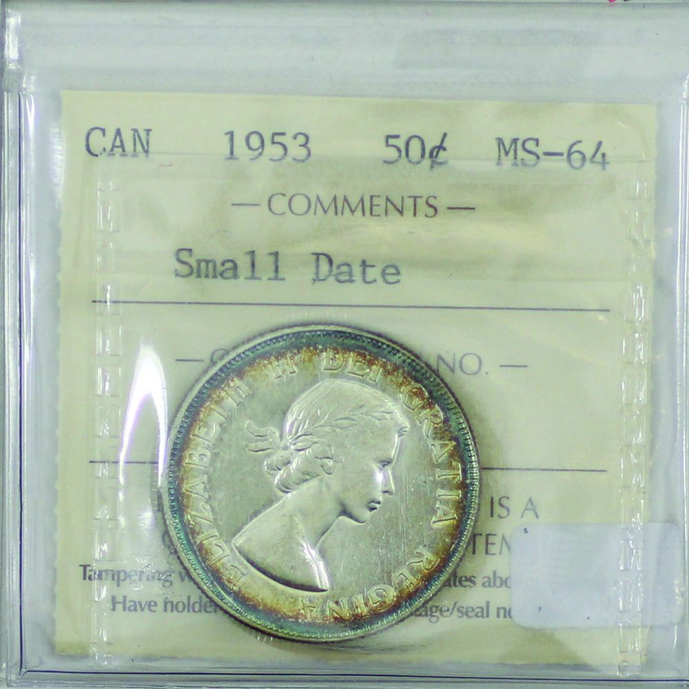 50-cent 1953 Small Date variety ICCS Certified MS-64. Attractive toning.